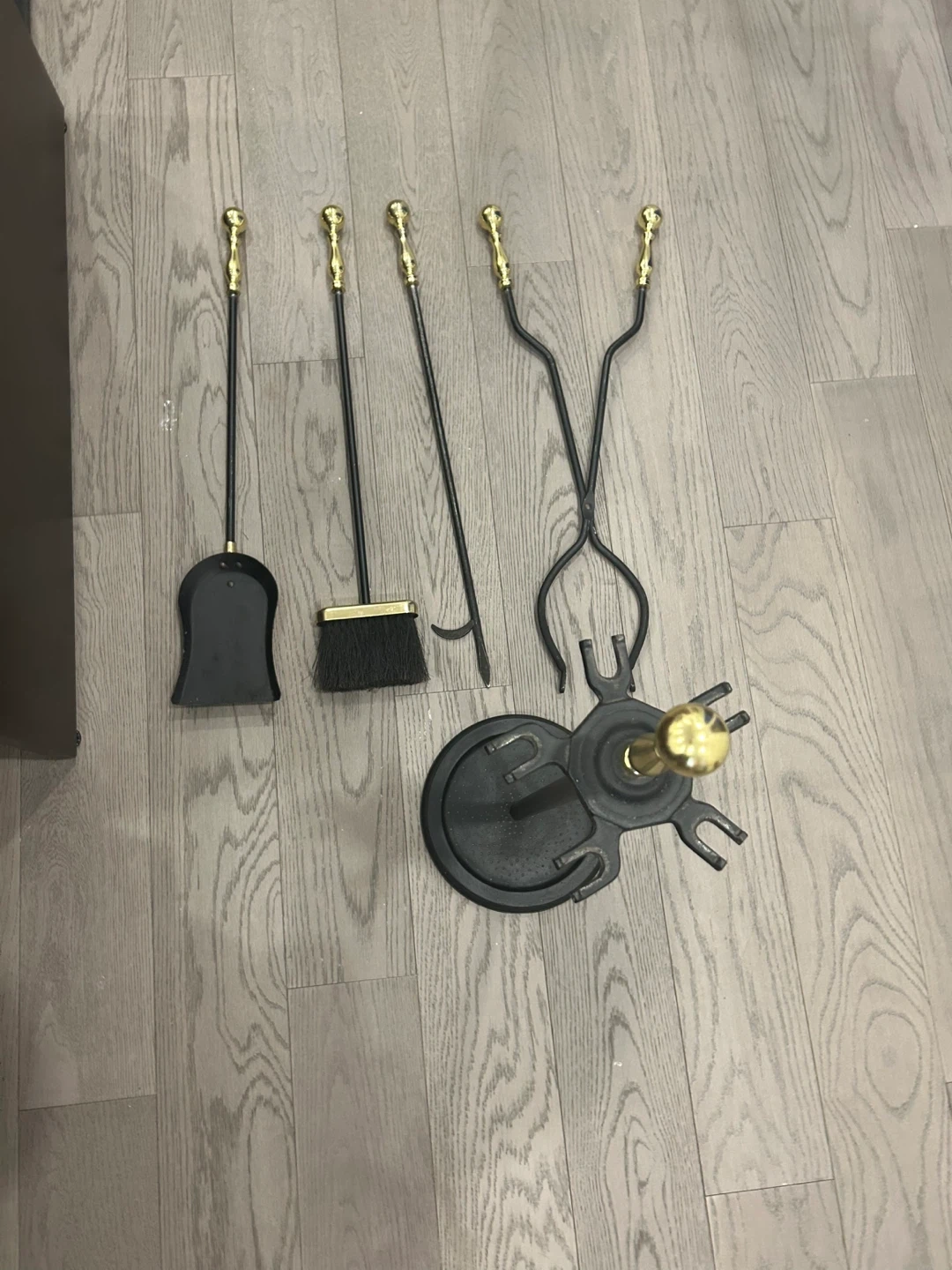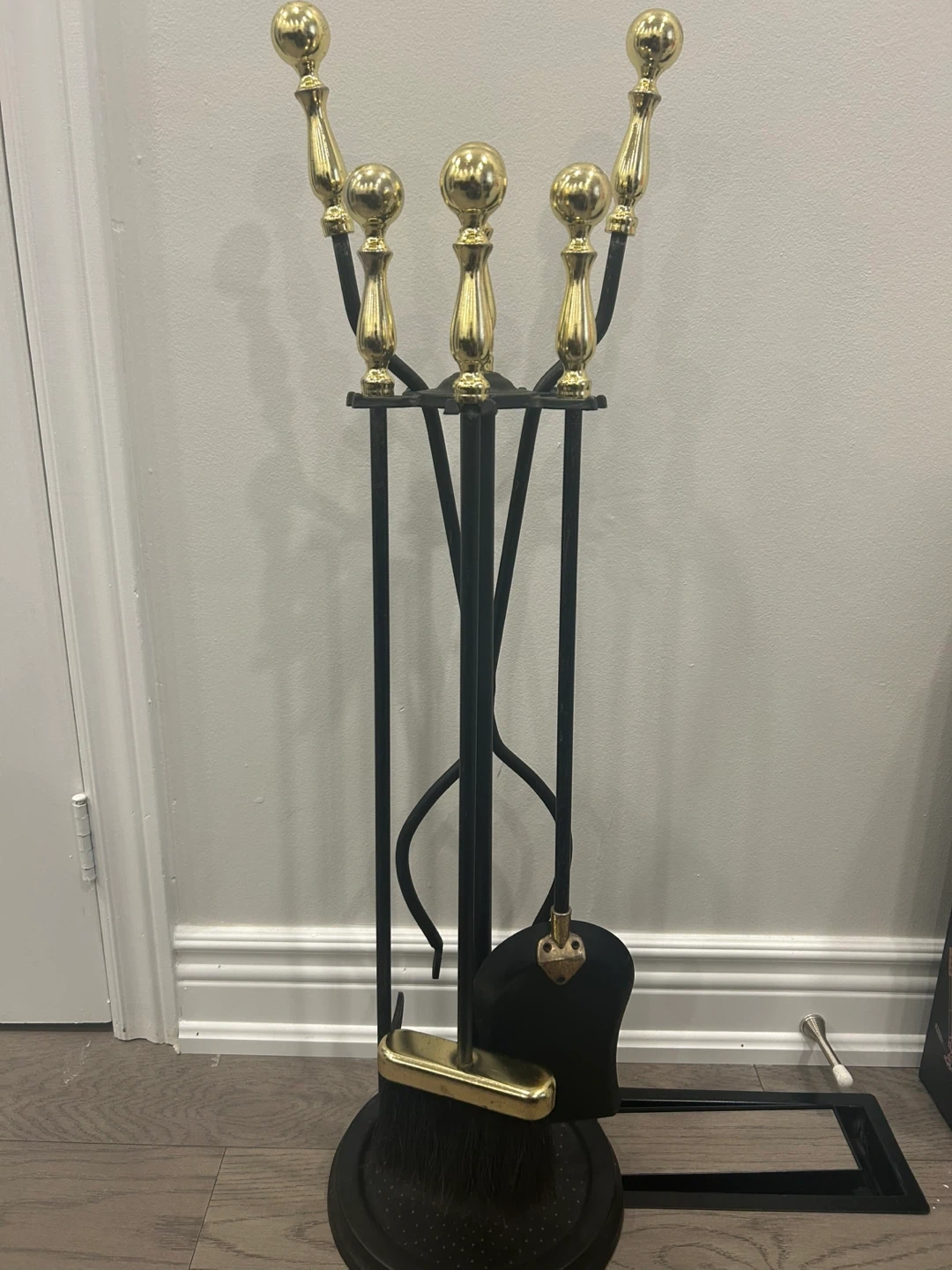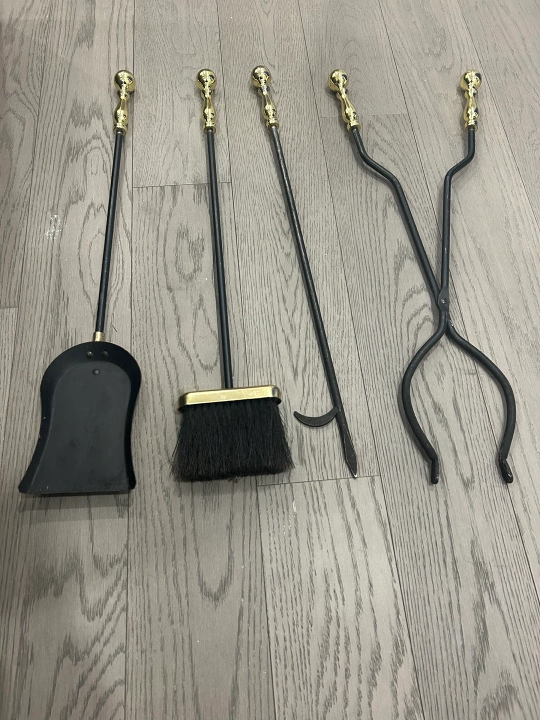 This fireplace tool set includes a shovel, broom, poker, and tongs with a stand. It's made of durable metal with decorative brass ball finials. Keep your fireplace tidy and safe with this essential set! Barely used and looks great with any fireplace. Price negotiable