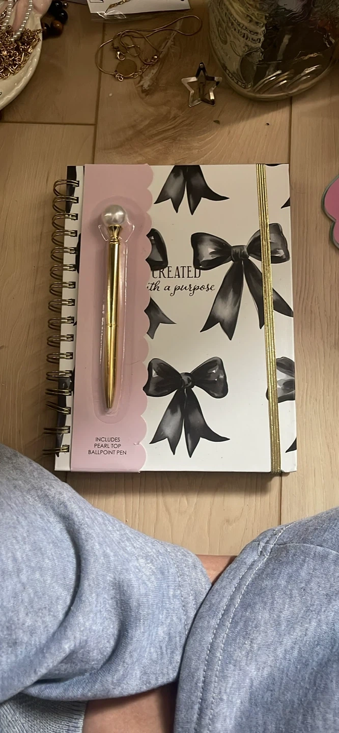 This cute notebook set features a "Created with a Purpose" design with black bows. It includes a fancy gold ballpoint pen with a pearl top. Great for planning or journaling!