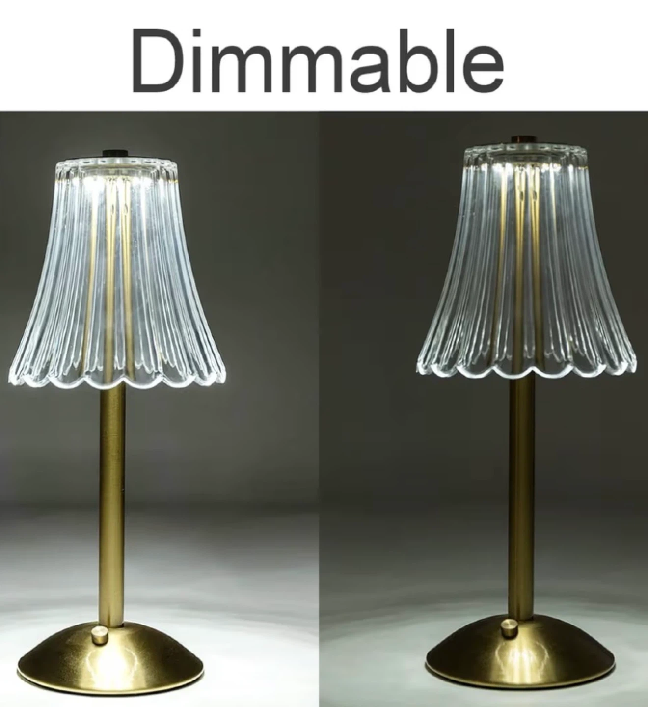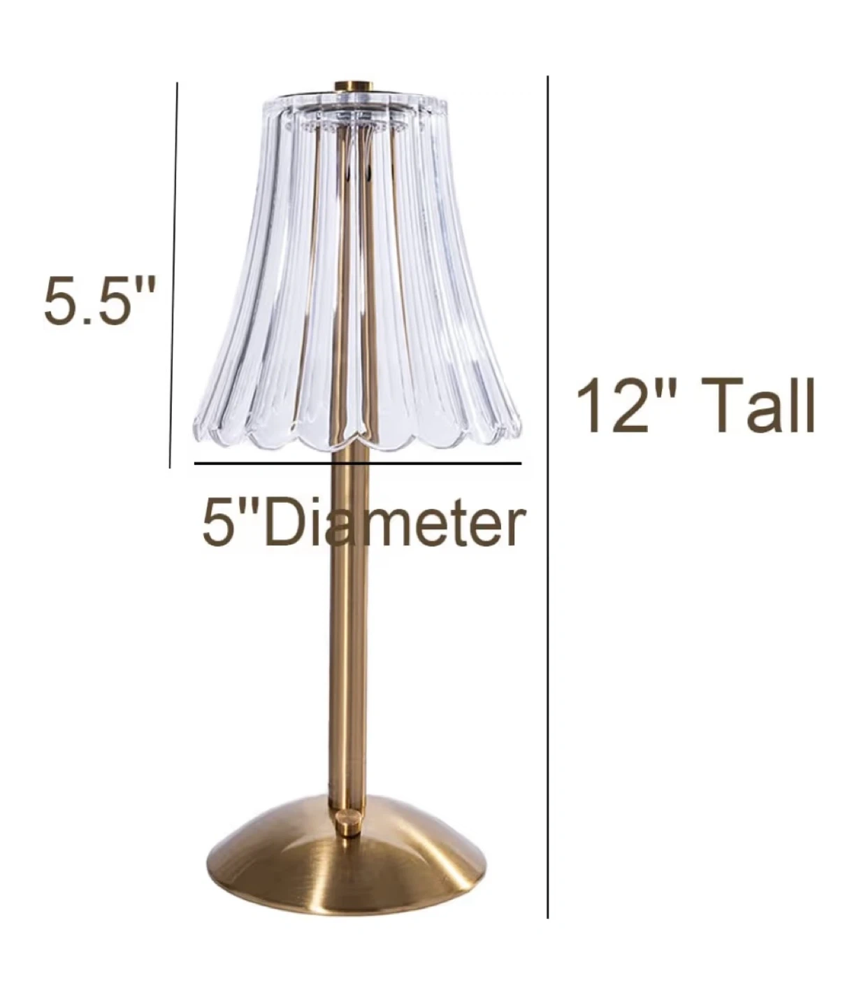 These lamps are 12" tall with a 5" diameter base and acrylic shades. They're USB rechargeable and dimmable with multiple light colour settings. Perfect for adding ambient light to any room!