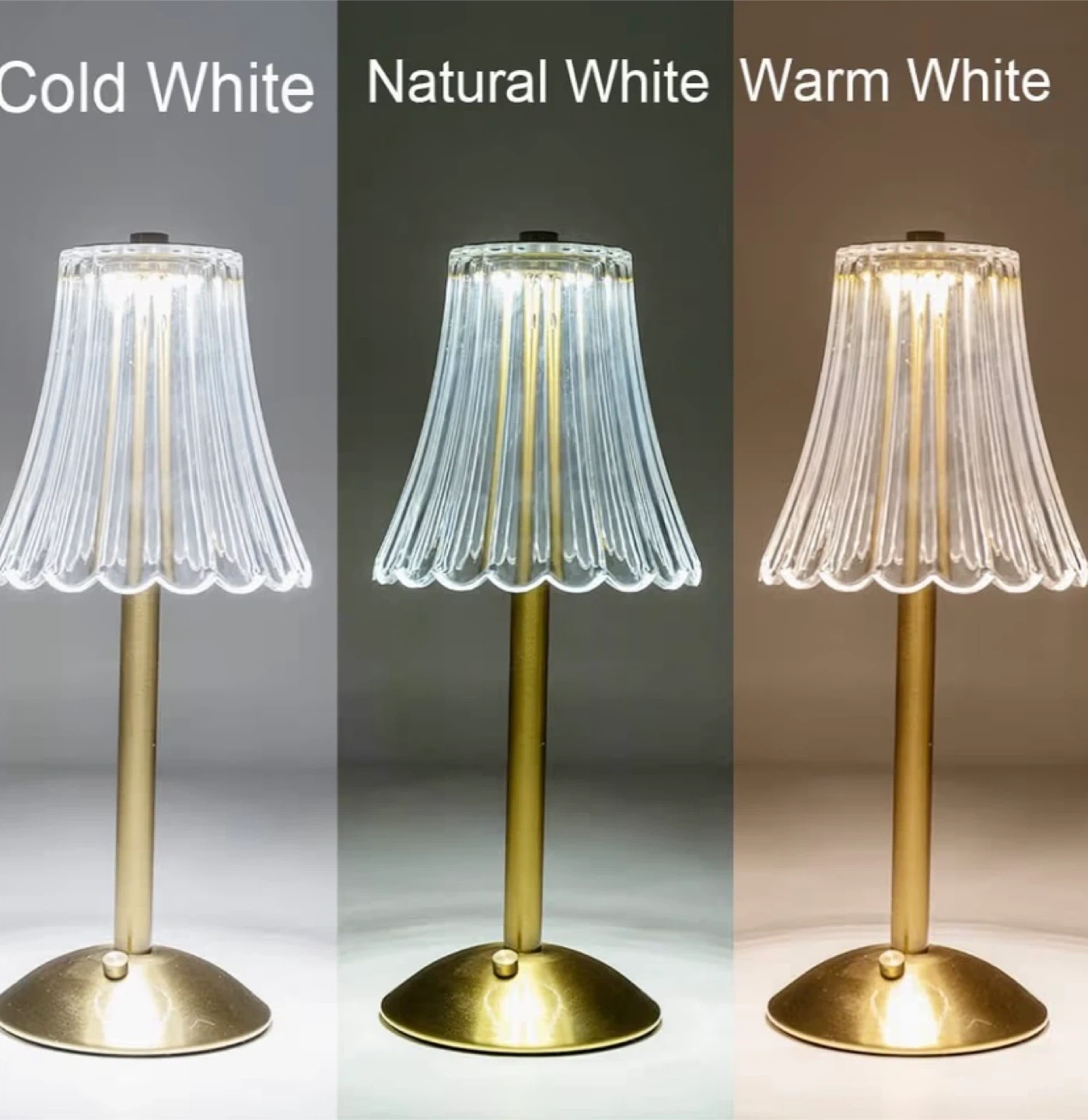 These lamps are 12" tall with a 5" diameter base and acrylic shades. They're USB rechargeable and dimmable with multiple light colour settings. Perfect for adding ambient light to any room!