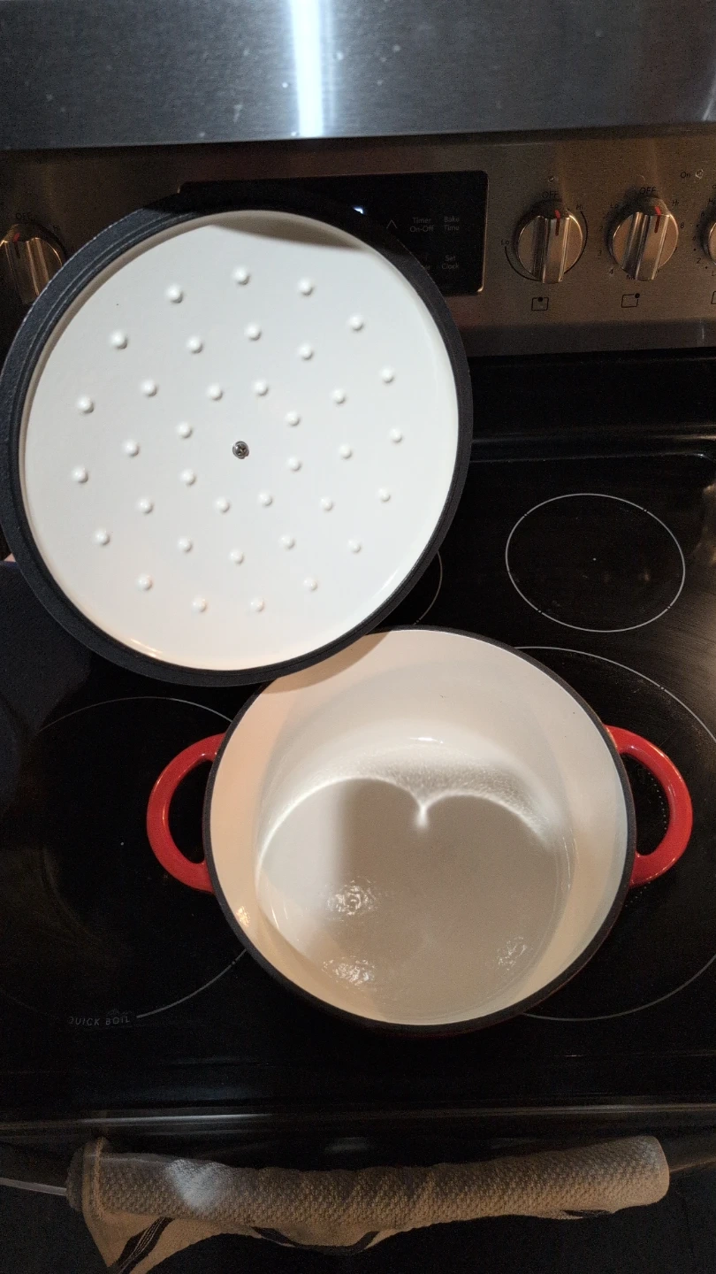 This red cast iron Dutch oven from Unite Chef comes with a self-basting lid. It's great for braising, stewing, and baking. The enameled interior is easy to clean.