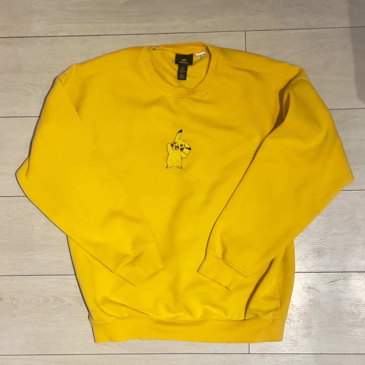 Selling a bright yellow H&M sweatshirt featuring an embroidered Pikachu! It's an oversized fit, size XL. Perfect for adding a pop of colour to your wardrobe! In decent condition with some darker discolouration on the back.