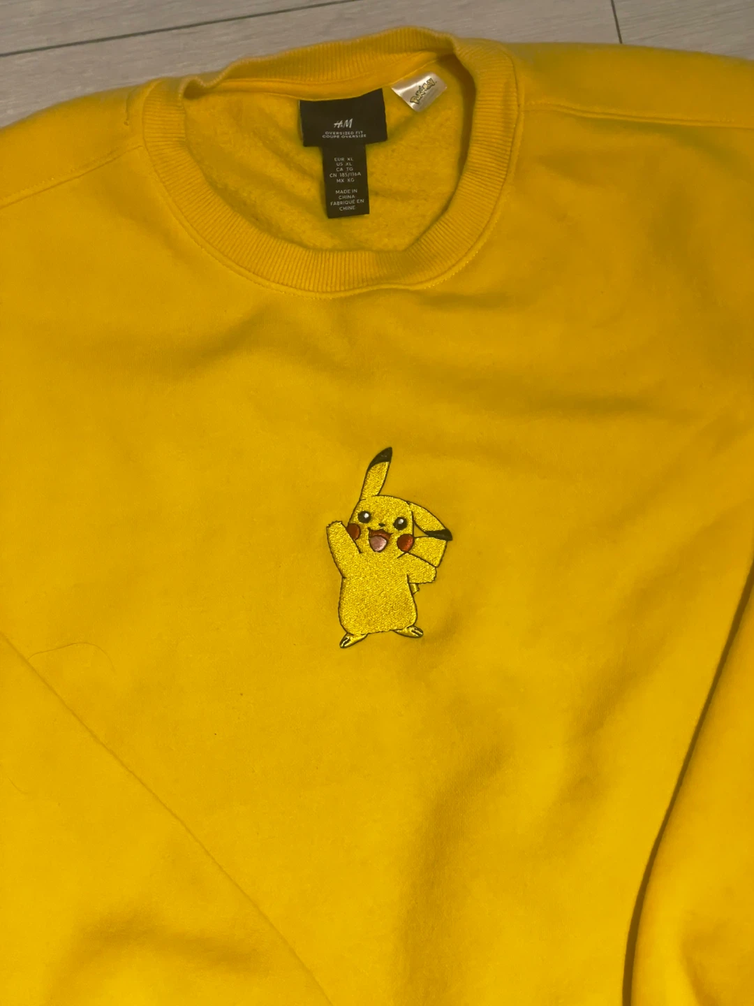Selling a bright yellow H&M sweatshirt featuring an embroidered Pikachu! It's an oversized fit, size XL. Perfect for adding a pop of colour to your wardrobe! In decent condition with some darker discolouration on the back.