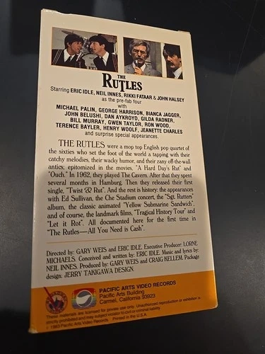 The "I Love The Rutles" VHS tape from 1983 is a vintage comedy movie starring Eric Idle. This film is a spoof of the Beatles, blending elements of parody and satire to create a hilarious and entertaining experience. Produced by Pacific Arts, this English-language movie offers a unique take on the iconic band, making it a must-have for fans of comedy and music history.