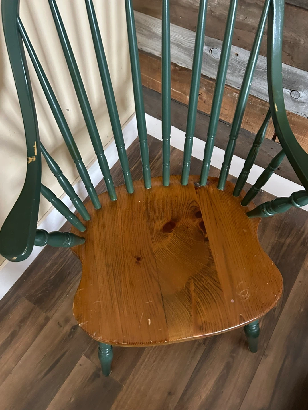 $15 each I have eight of them buy one or buy eight A classic Windsor style wooden chair with a dark green painted frame and a natural wood seat. This chair features a spindle back and curved arms. It's a sturdy piece of furniture.