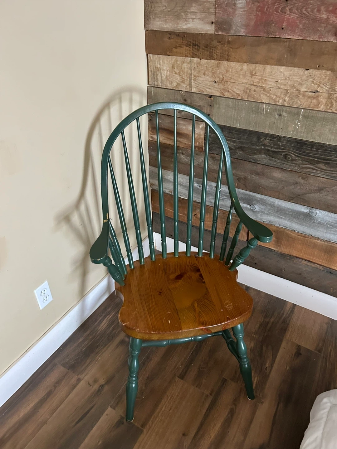 $15 each I have eight of them buy one or buy eight A classic Windsor style wooden chair with a dark green painted frame and a natural wood seat. This chair features a spindle back and curved arms. It's a sturdy piece of furniture.