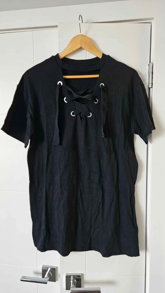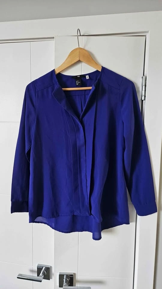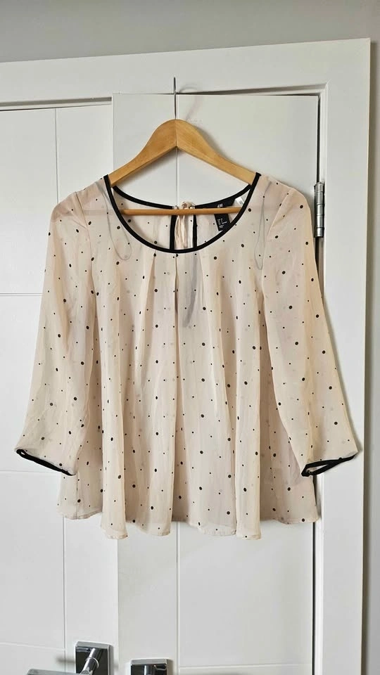 Cute collection of 6 women's tops. Dark blue floral long sleeve blouse has ruffles. Light sheer polka dot H&M blouse with black trim, 3/4 sleeves. Black short sleeve top has cool lace-up front. Sleeveless top with abstract pattern. Royal blue H&M long sleeve blouse. Grey long sleeve top with pretty textured design. Size 4/M.