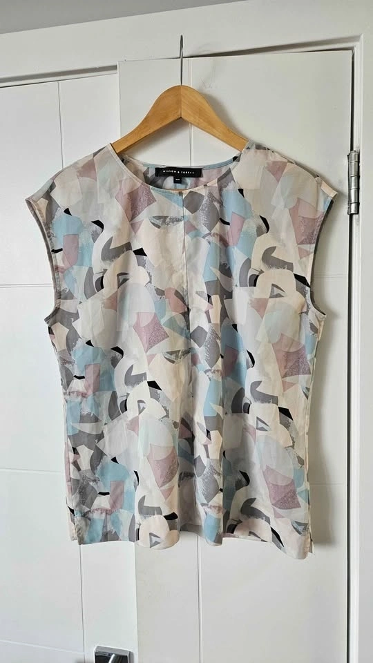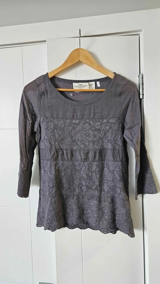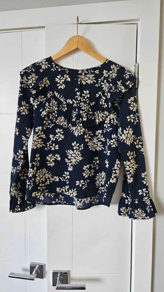 Cute collection of 6 women's tops. Dark blue floral long sleeve blouse has ruffles. Light sheer polka dot H&M blouse with black trim, 3/4 sleeves. Black short sleeve top has cool lace-up front. Sleeveless top with abstract pattern. Royal blue H&M long sleeve blouse. Grey long sleeve top with pretty textured design. Size 4/M.