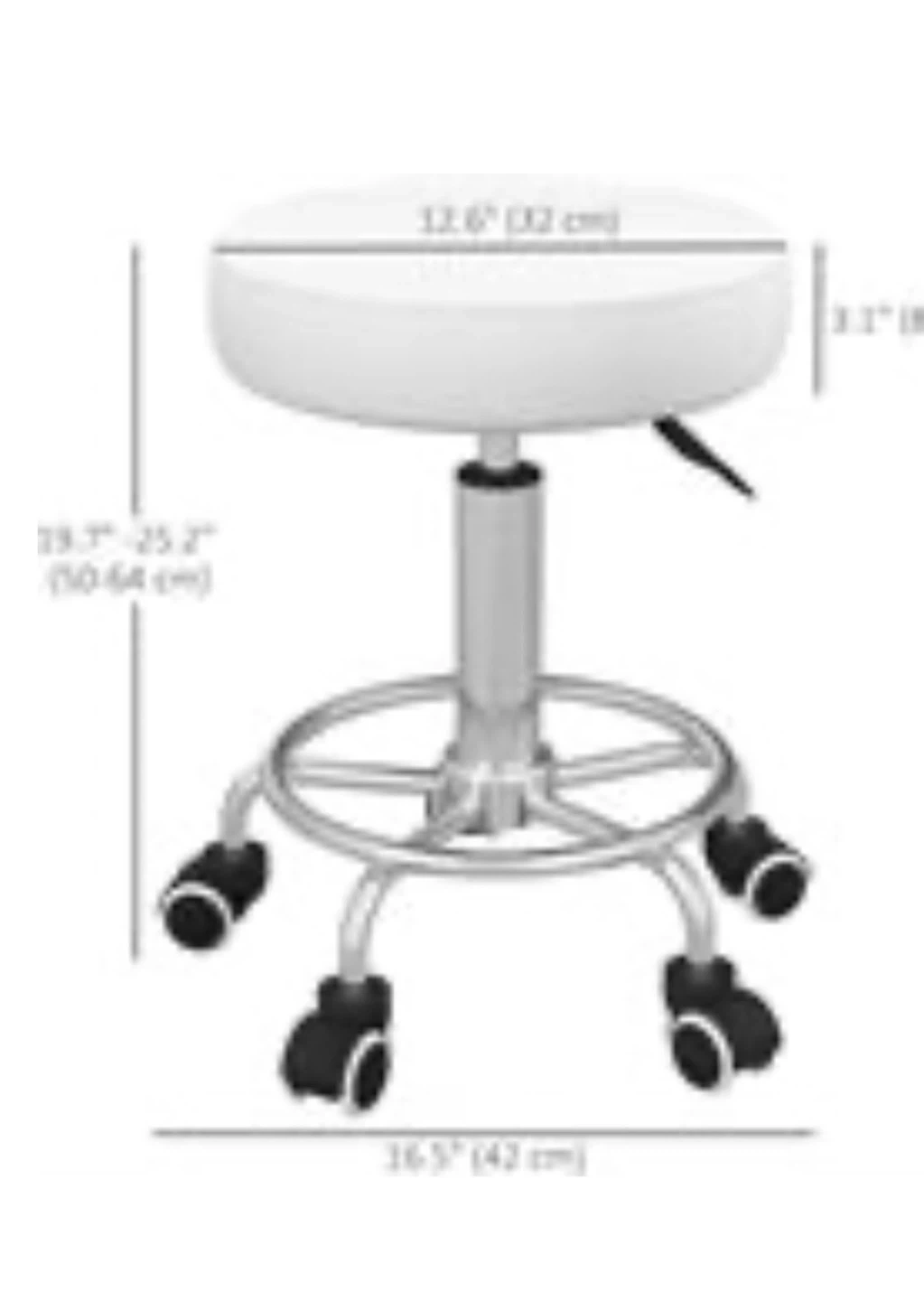 White adjustable rolling stool. Seat diameter is 12.6" (32 cm) and height adjusts from 19.7"-25.2" (50-64 cm). Base width is 16.5" (42 cm). It's easy to move around!