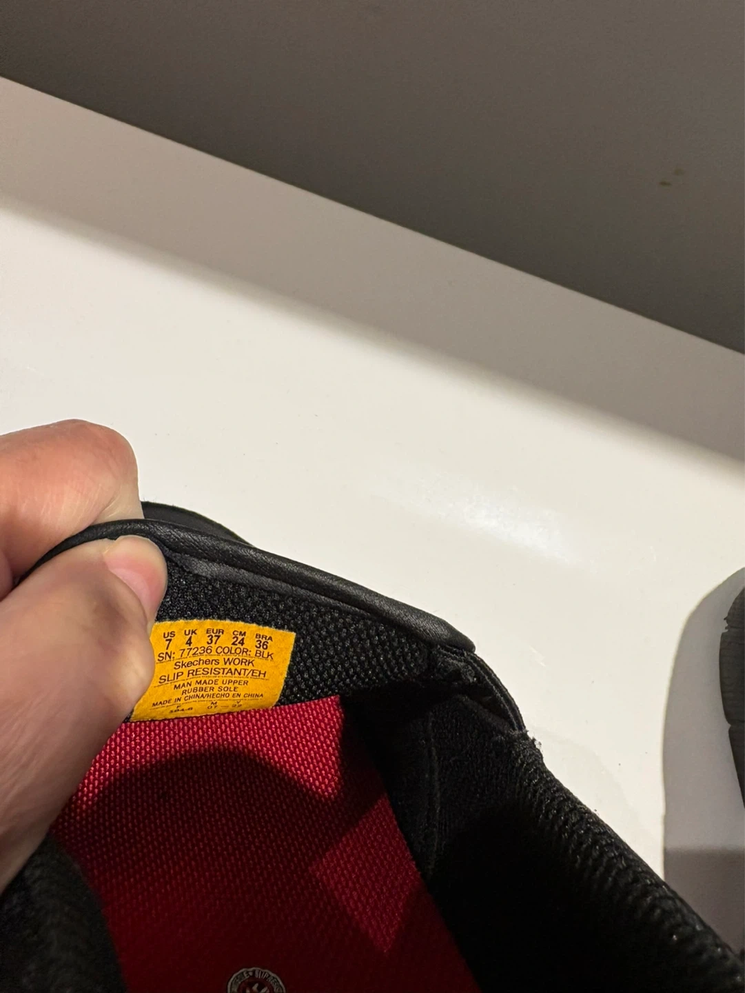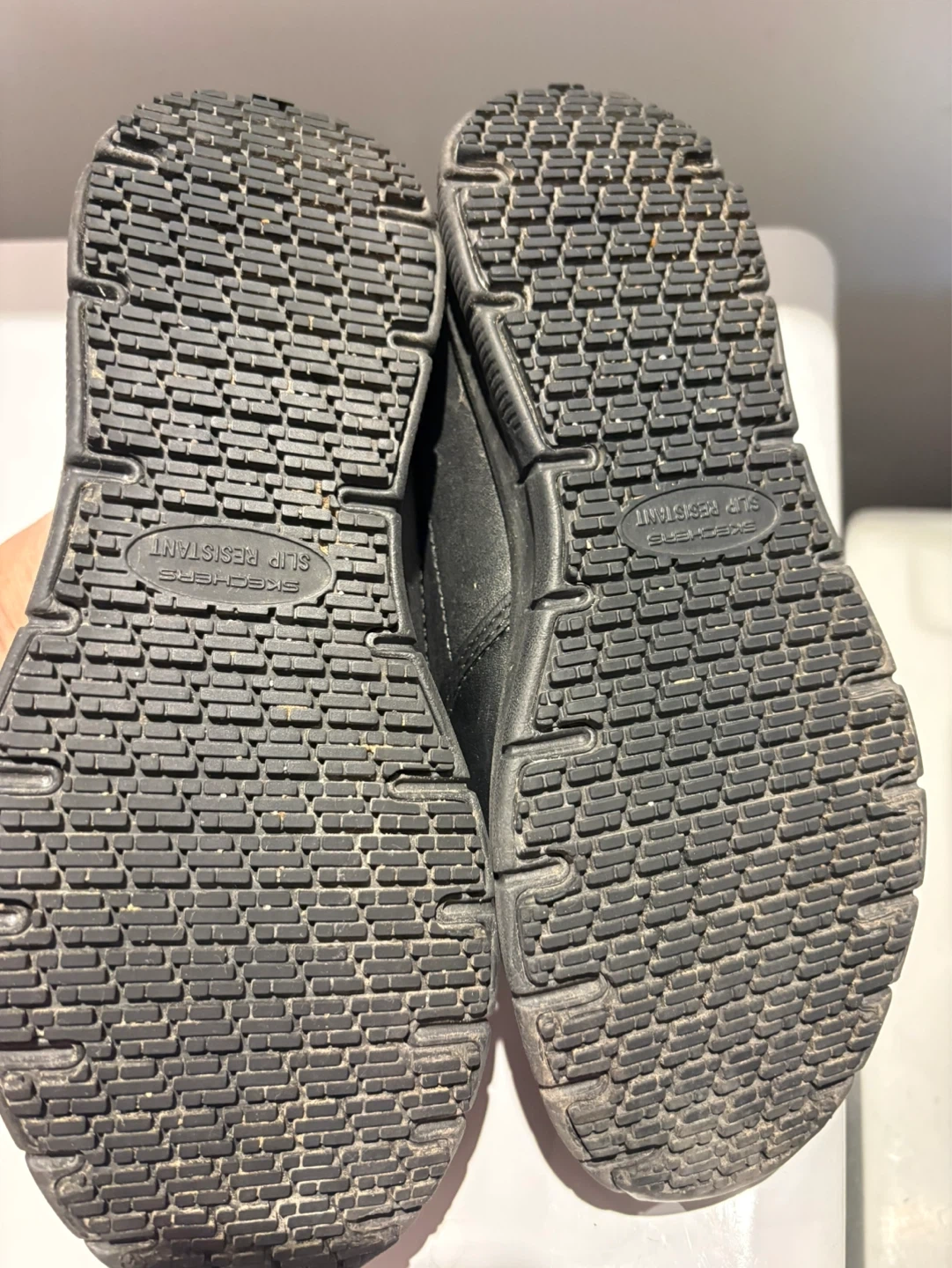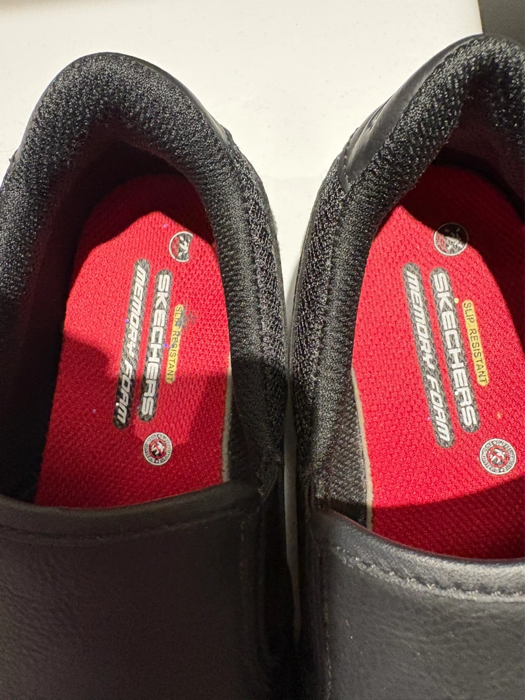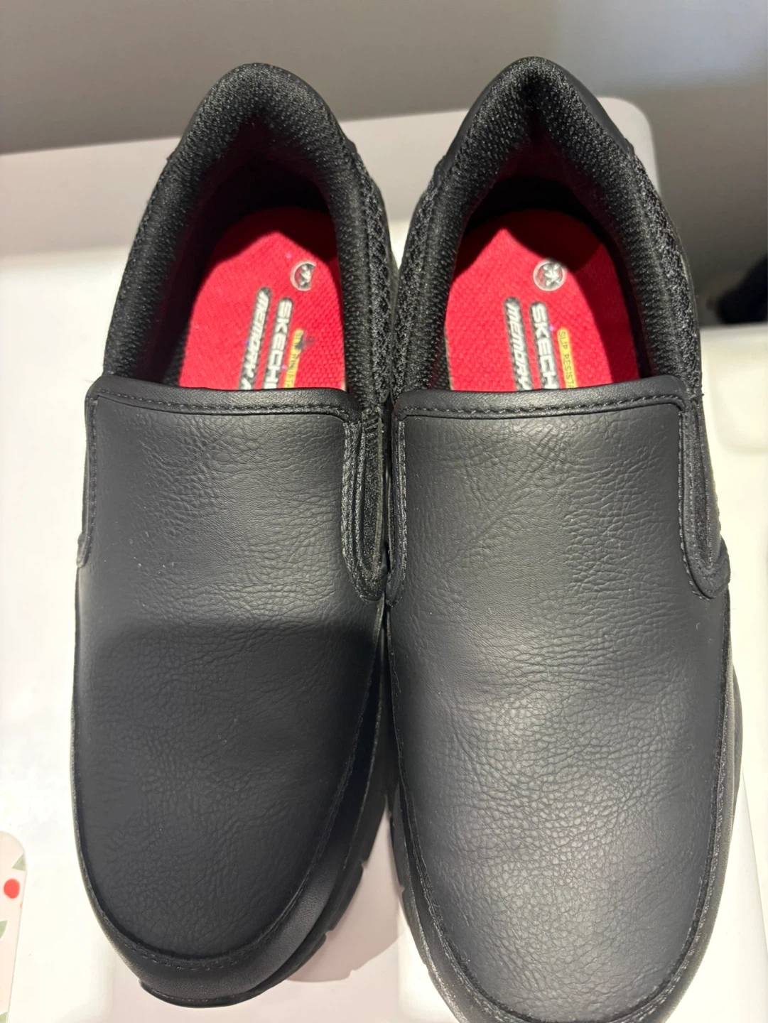 These black Skechers slip-on sneakers are designed with a memory foam insole for comfort. They feature slip-resistant soles, making them a good choice for work environments.