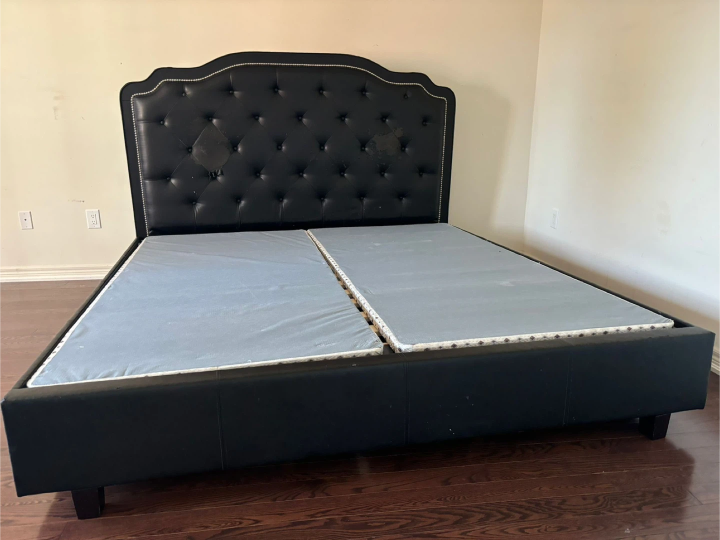 Selling a black tufted king bed frame. It's in good condition. The headboard features a tufted design with decorative accents.