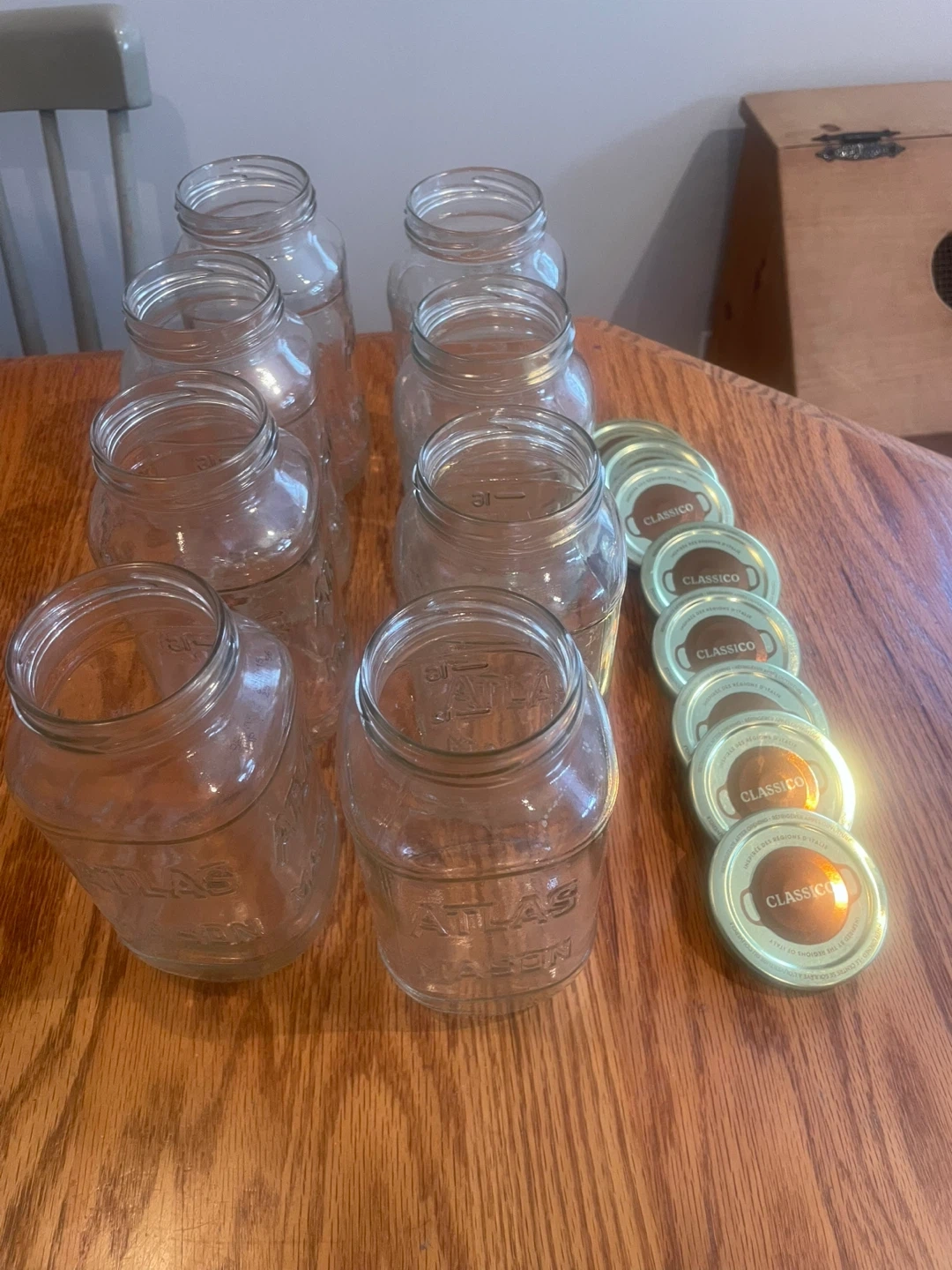 Set of 8 Atlas Mason jars. Includes multiple lids for sealing. Great for preserving or storage!