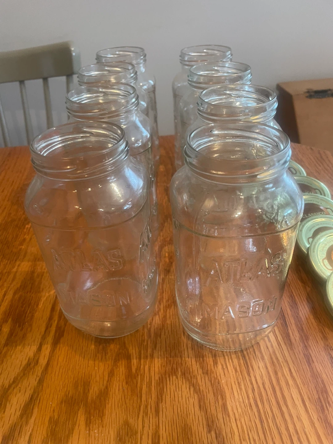Set of 8 Atlas Mason jars. Includes multiple lids for sealing. Great for preserving or storage!