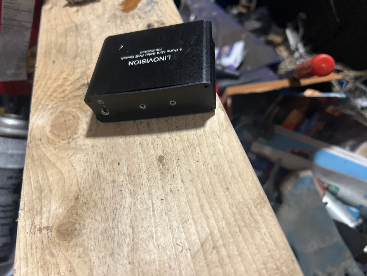 LINOVISION 4 Ports Mini Solar PoE Switch, model POE-SW504GD. This compact switch provides four PoE ports for your networking needs. It's designed for efficient power delivery over Ethernet.