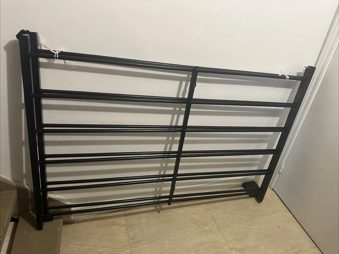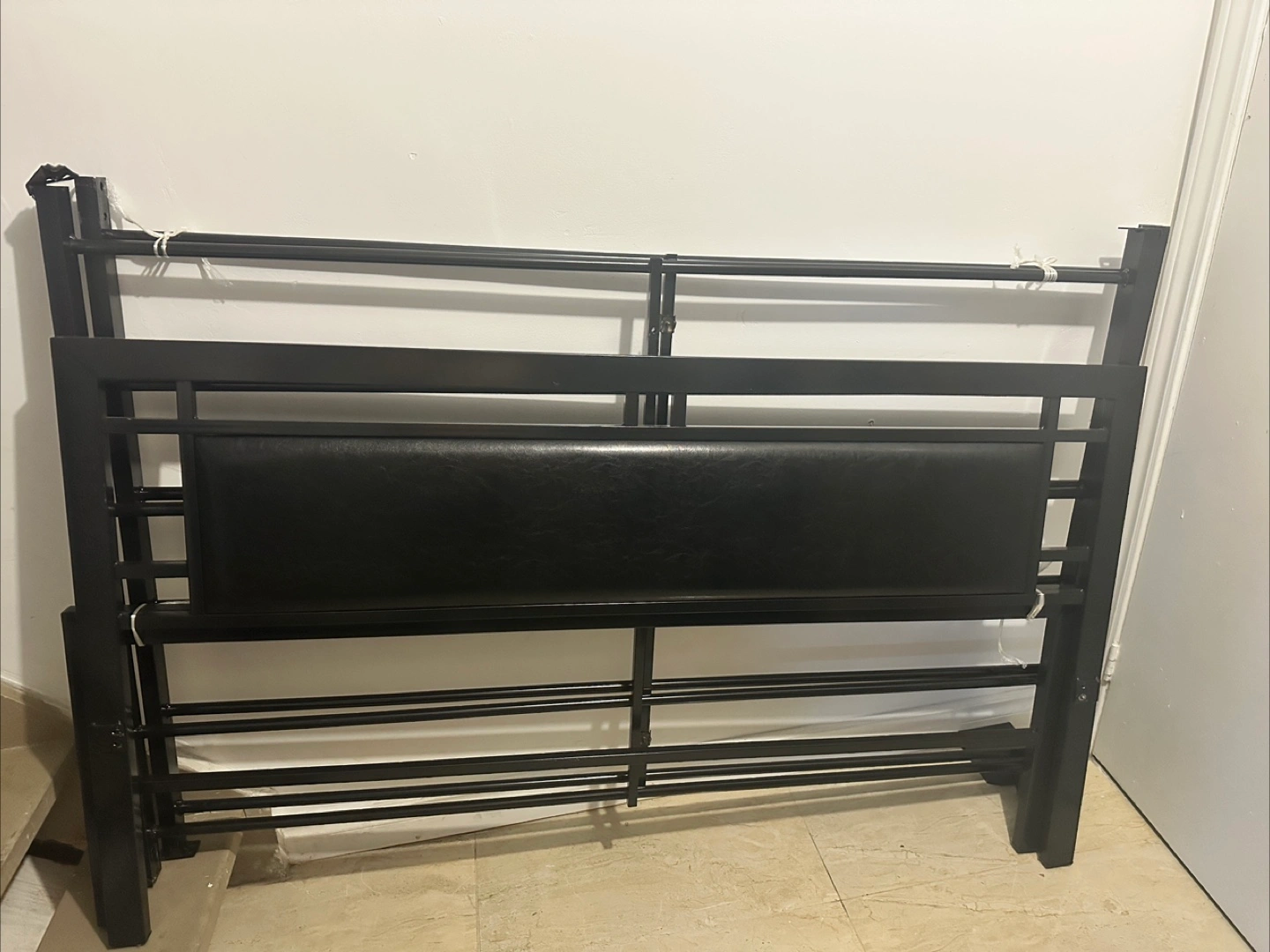A black metal bed frame. It’s queen bed frame. Perfect for a simple and comfortable sleep experience.Minor adjustment needed near bed frame leg but extra frame legs included.