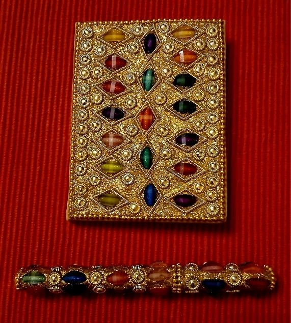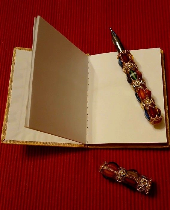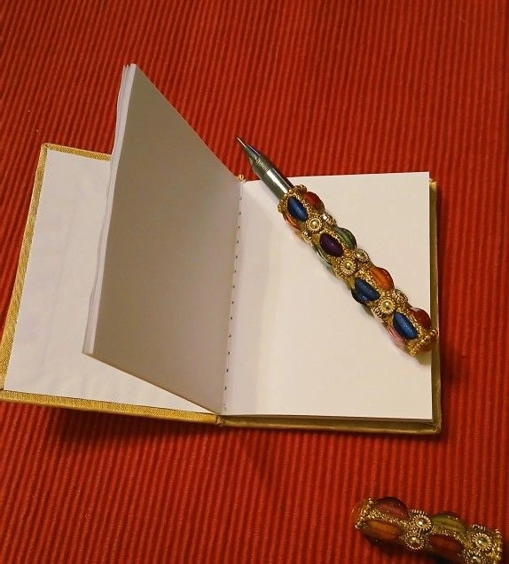 A beautiful little faux-jewel notebook and matching ballpoint pen. Would make a lovely gift or a special journal for yourself. The notebook is 3x4", the pen is 4.75" long. Came from India.