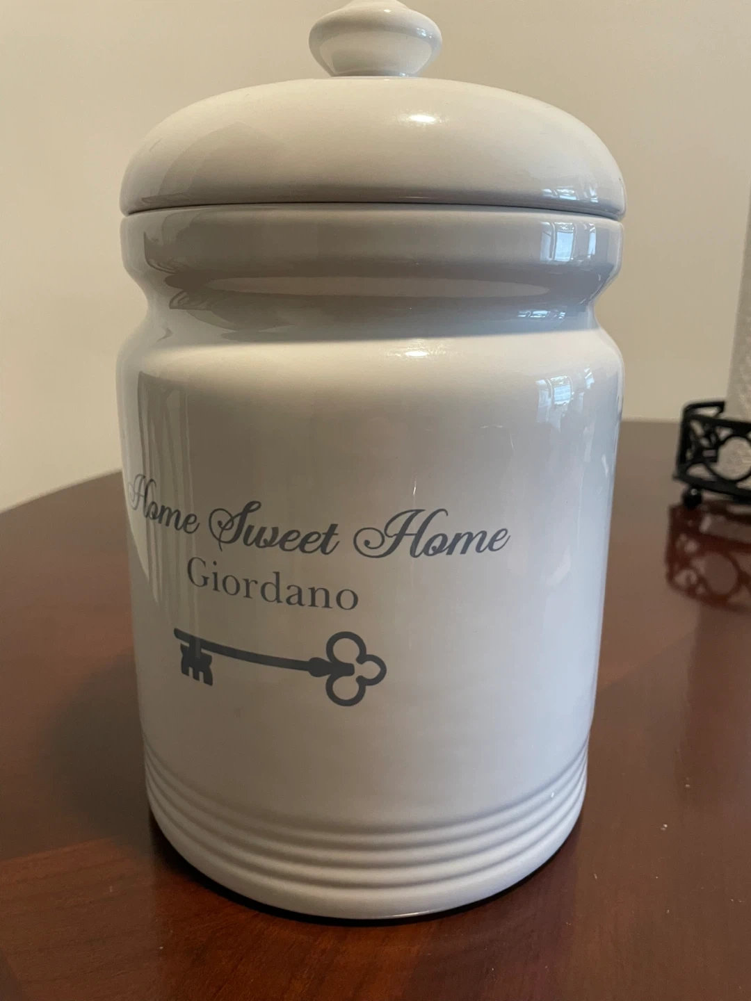 Beautiful, high-quality ceramic cookie jar featuring a timeless "Home Sweet Home" design with a decorative skeleton key.