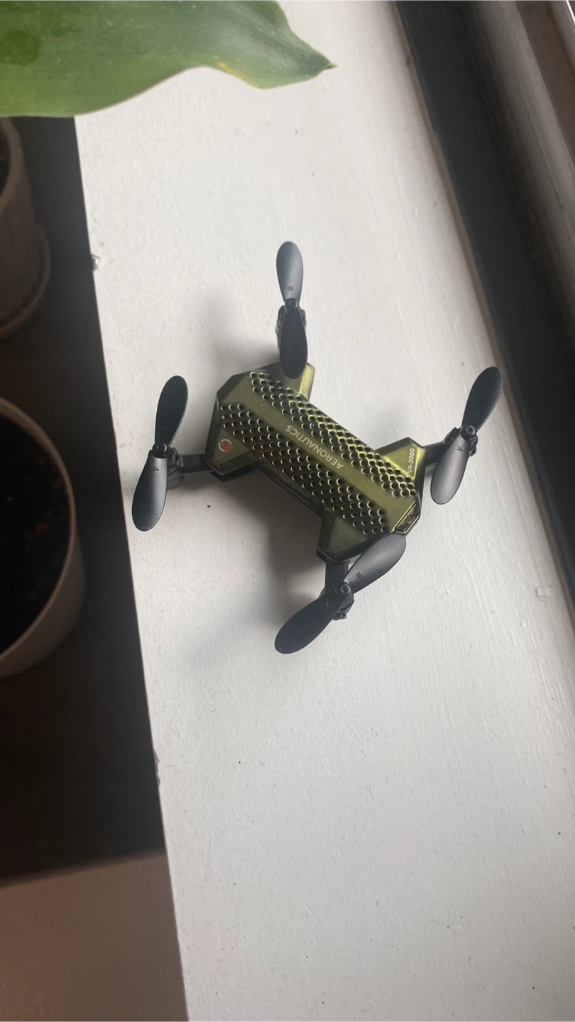 This is a Aeronauticas mini drone with its remote controller. It's green and has a compact design. It's ready for some aerial fun and practice.