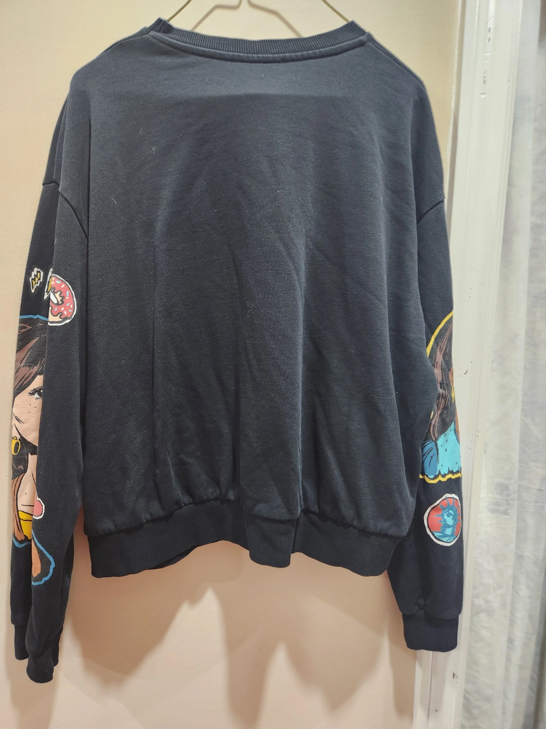 Black cropped sweatshirt. Features colourful graphic designs of women's faces and other pop art elements. Crew neck, long sleeves. Excellent for casual wear.