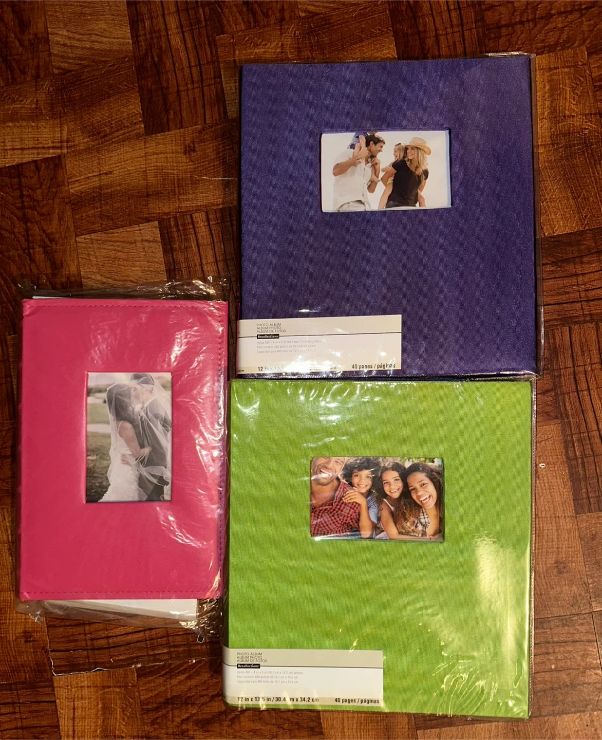 Set of three Recollection photo albums. Includes one purple, one hot pink, and one lime green album. Each album measures 12 in x 13.5 in and holds 40 pages. They feature a clear window on the cover to display a photo. $30 each