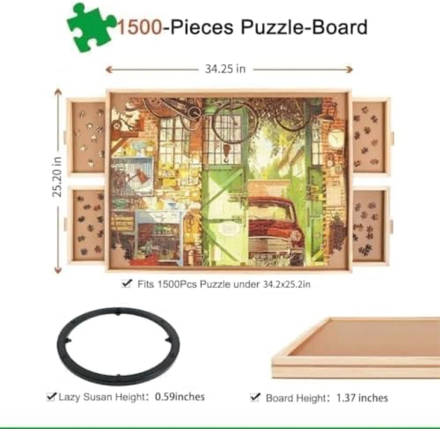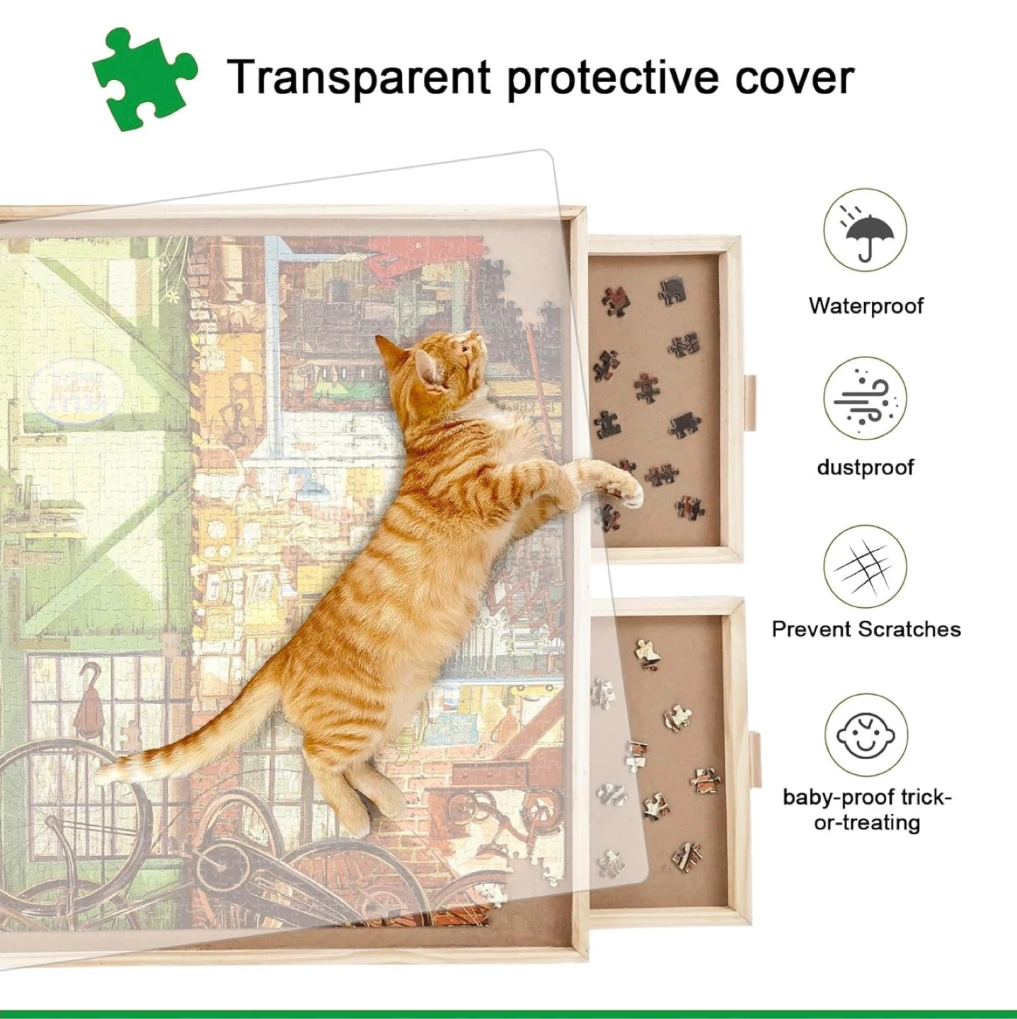 S This puzzle board is made of quality hardwood and measures 34.25 x 25.20 inches, fitting up to 1500 pieces. It features 4 pull-out drawers for sorting your puzzle pieces. A transparent protective cover is also included to keep pieces safe from dust and scratches.