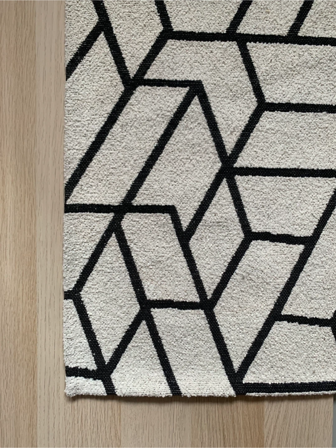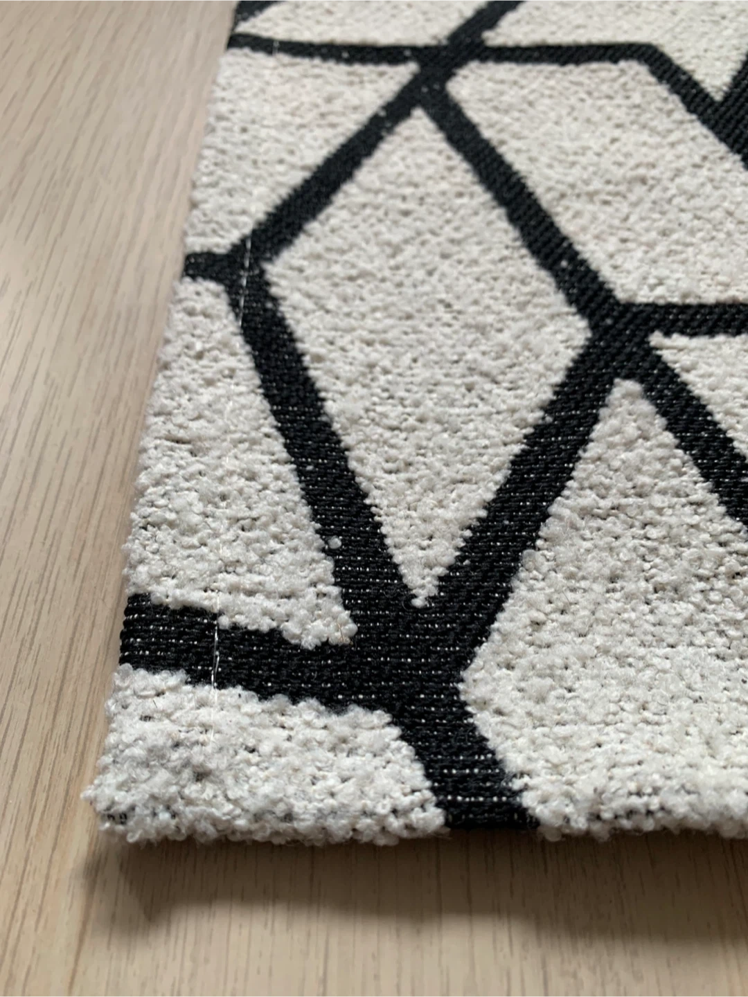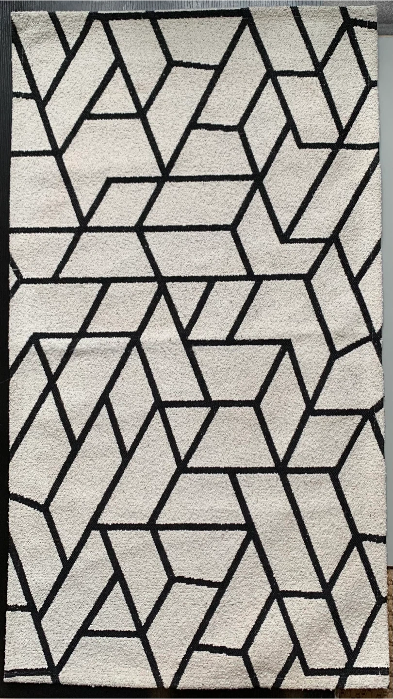 • Area rug featuring a cream and black geometric pattern.