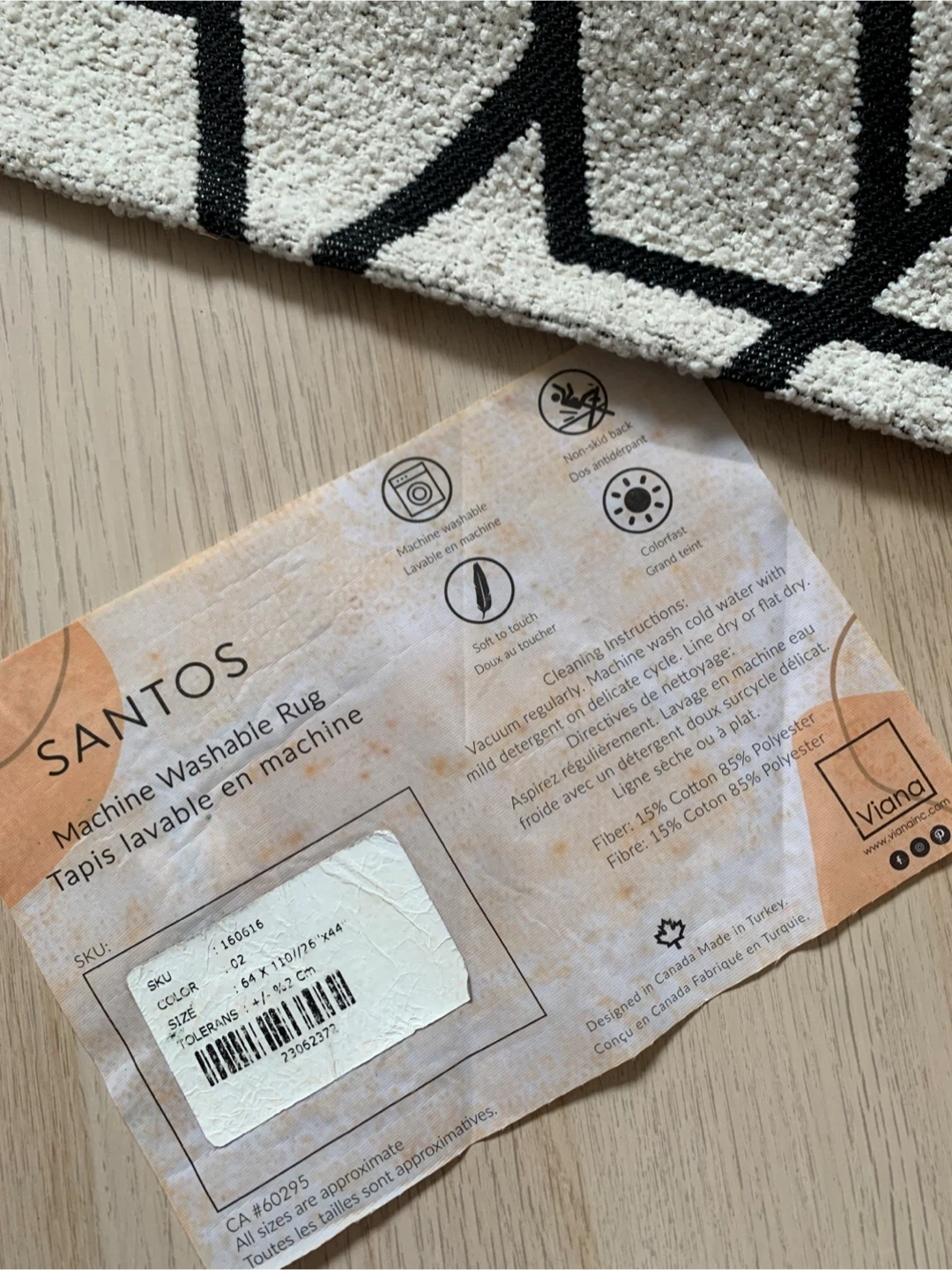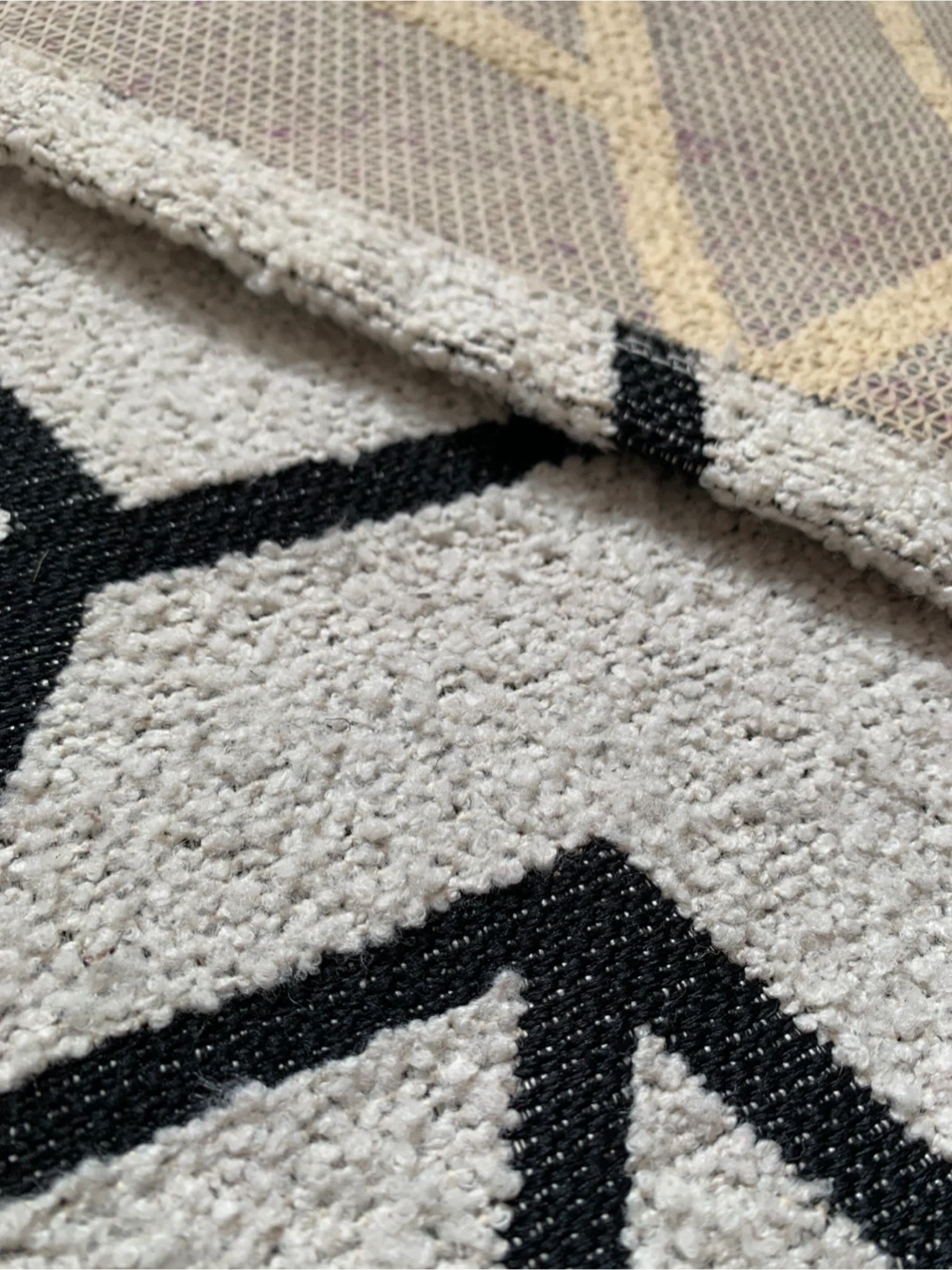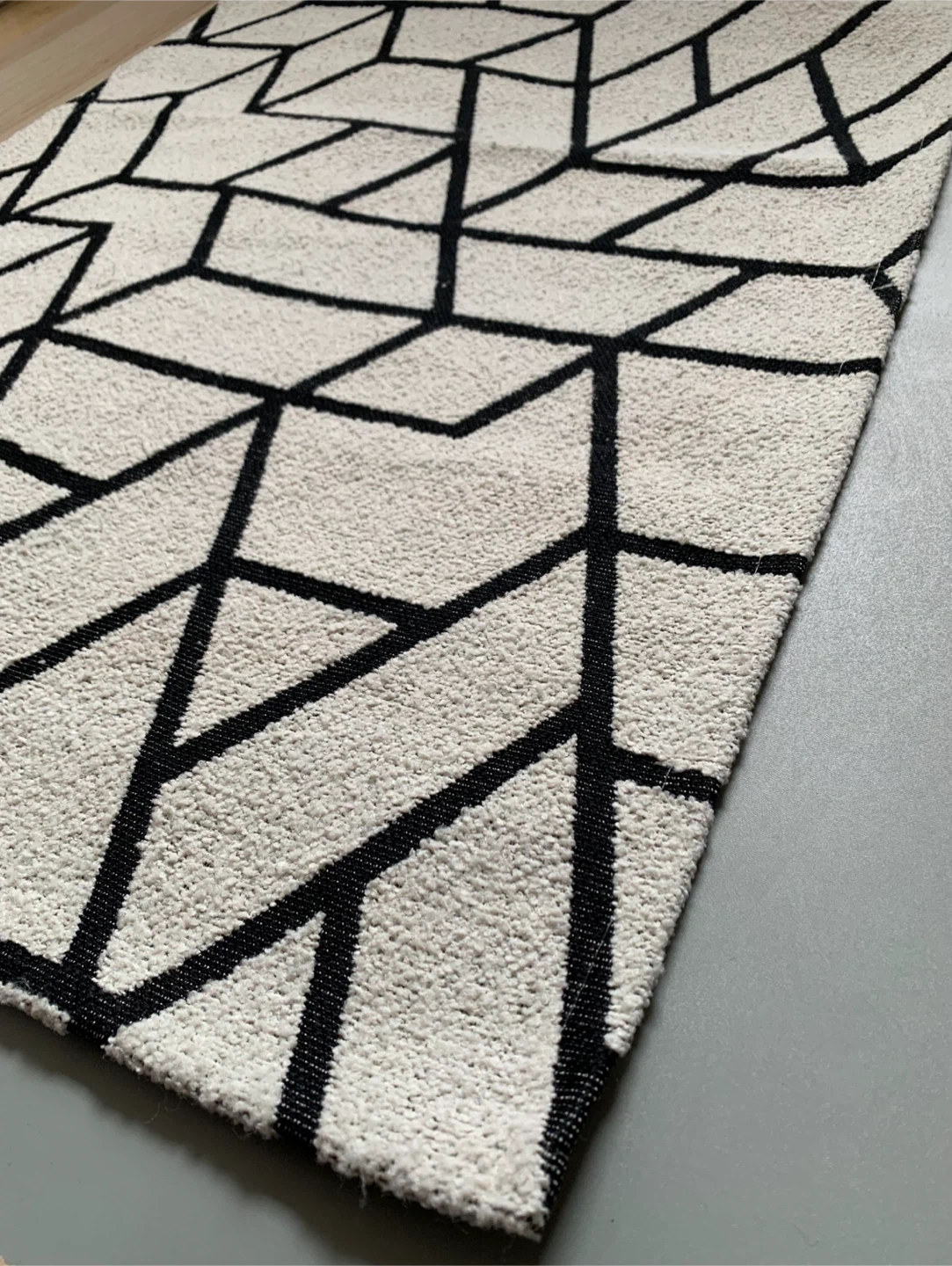 • Area rug featuring a cream and black geometric pattern.