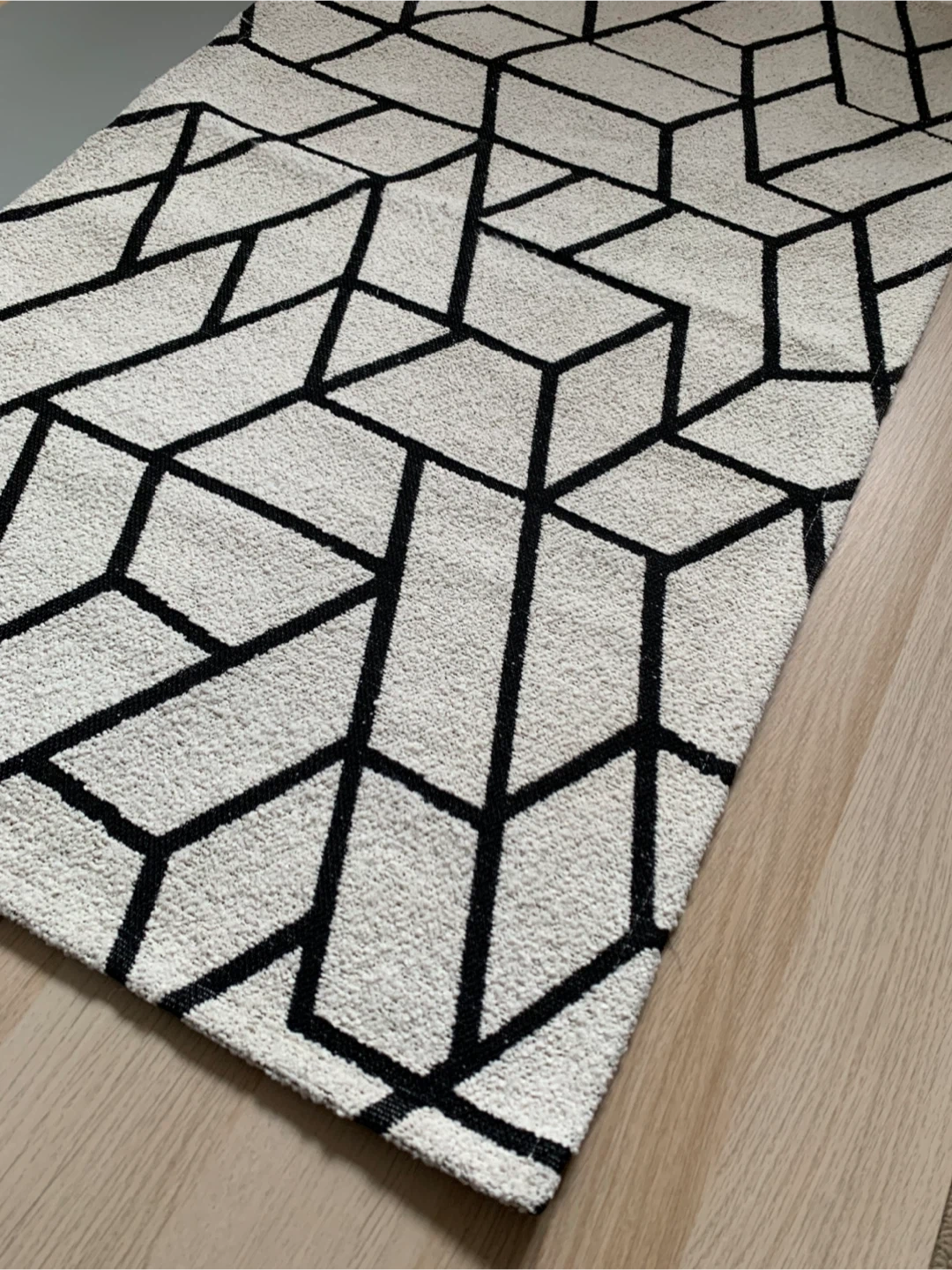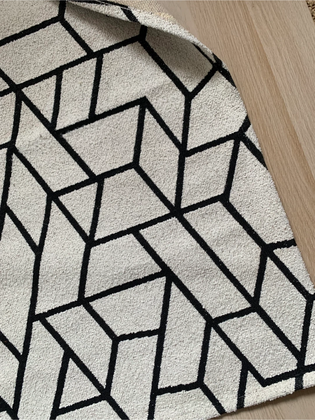 • Area rug featuring a cream and black geometric pattern.