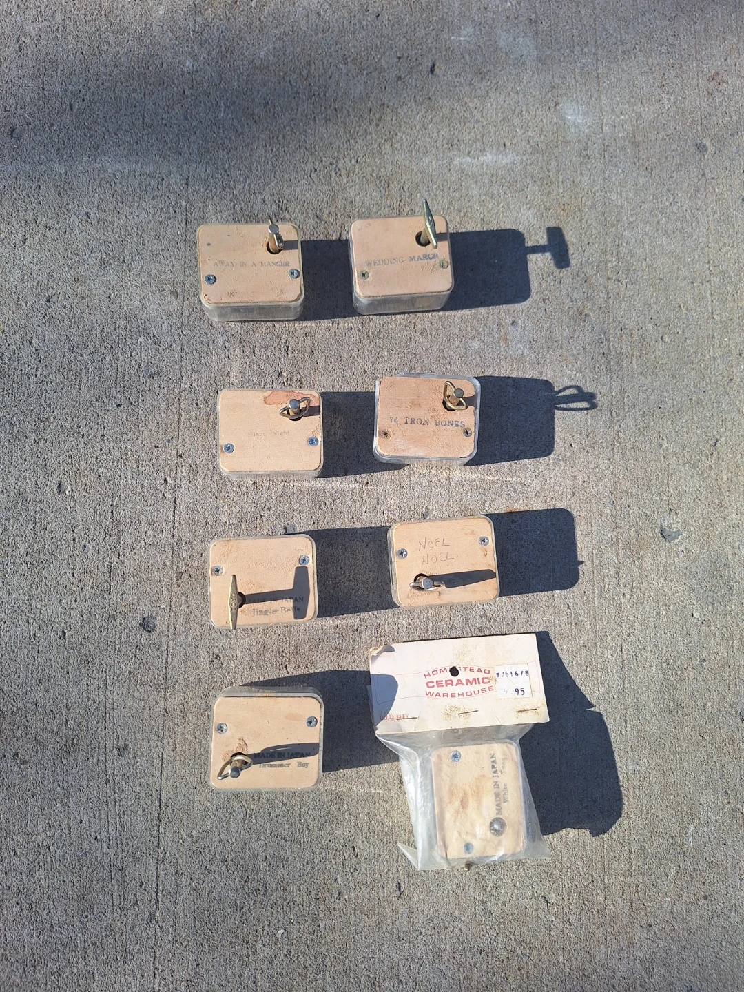 Music box mechanisms, each playing a different tune. Tunes include 'Away in a Manger', 'Wedding March', '76 Trombones', 'Jingle Bells', and two variations of 'Noel'. $10 each