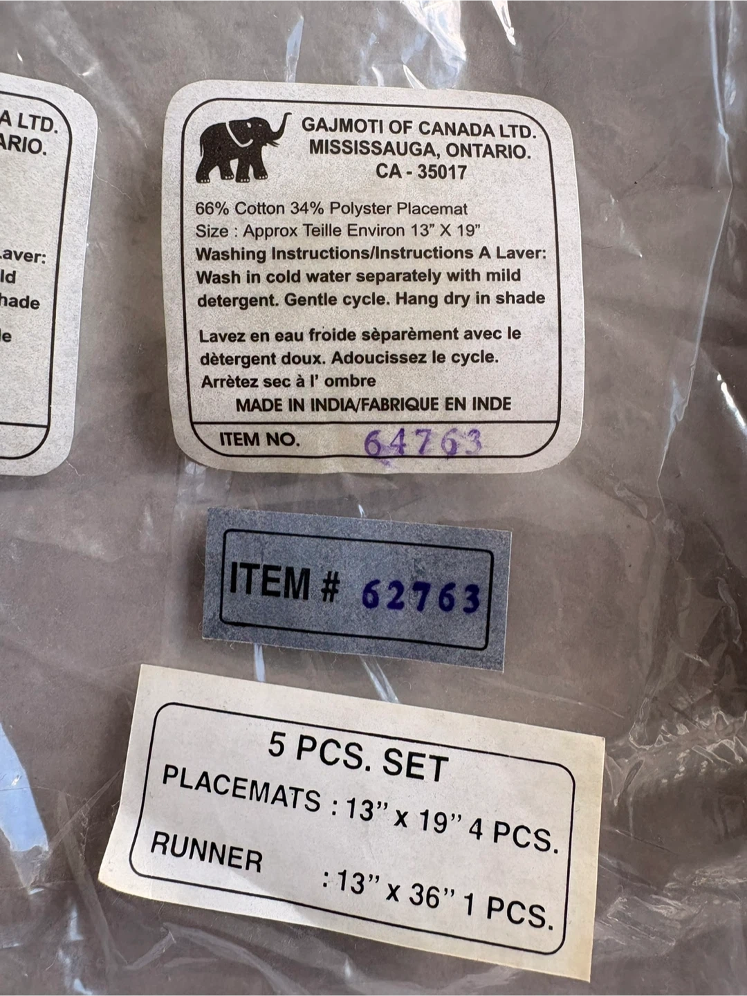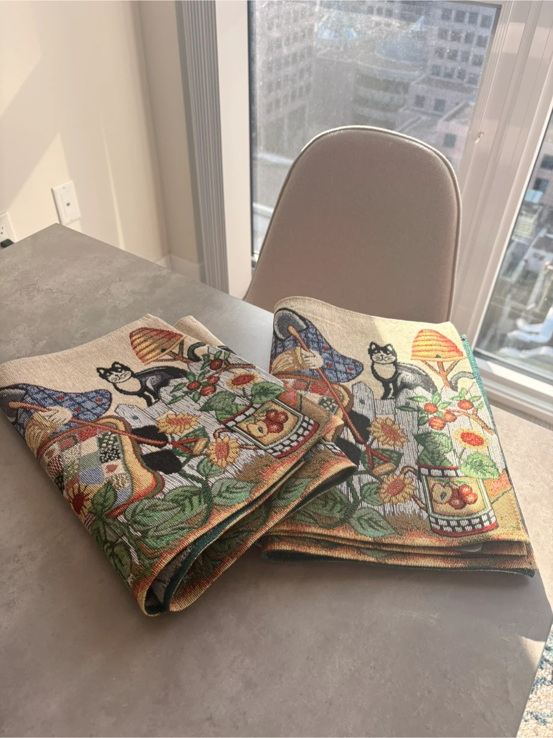 Charming country-style placemat and table runner set by Gajmoti of Canada Ltd. (Mississauga). Includes 4 placemats and 1 matching table runner with a cute farmhouse design featuring a farm girl, cat, and sunflowers. Clean and in excellent condition—great for cozy kitchen or seasonal décor.