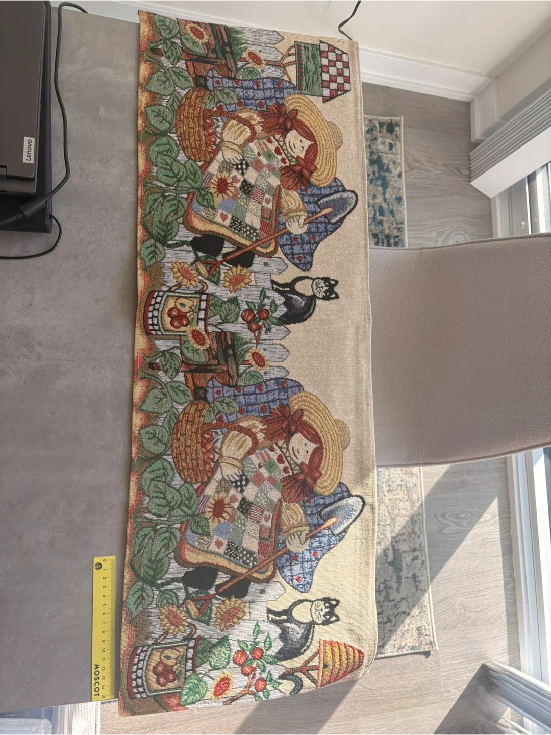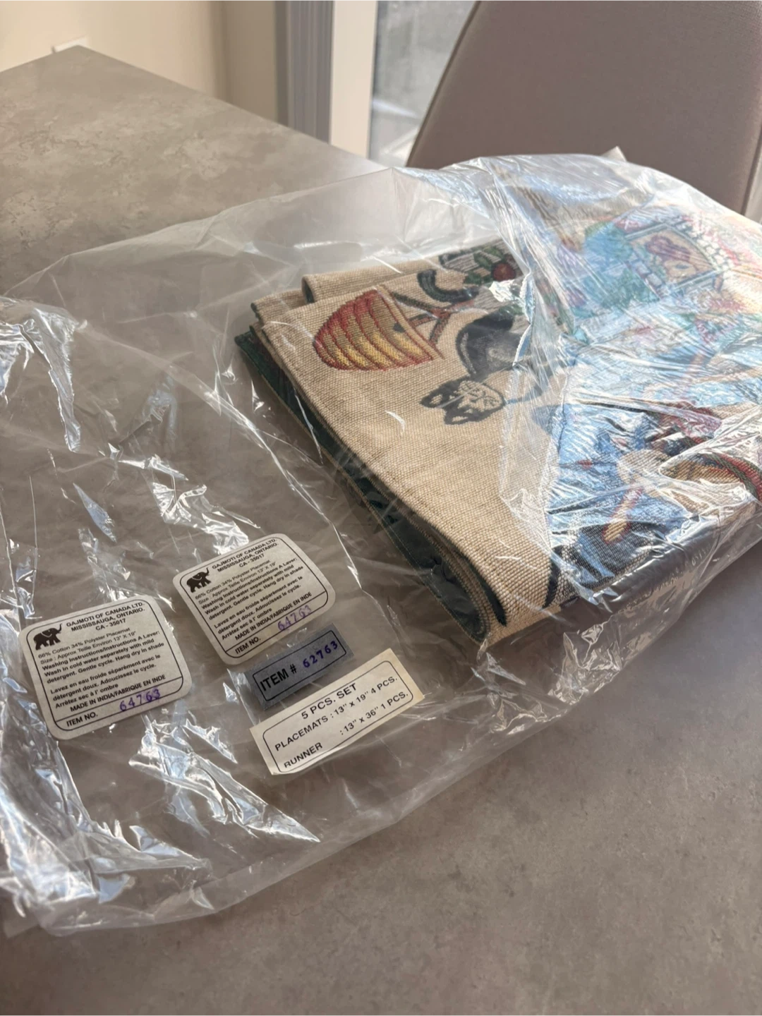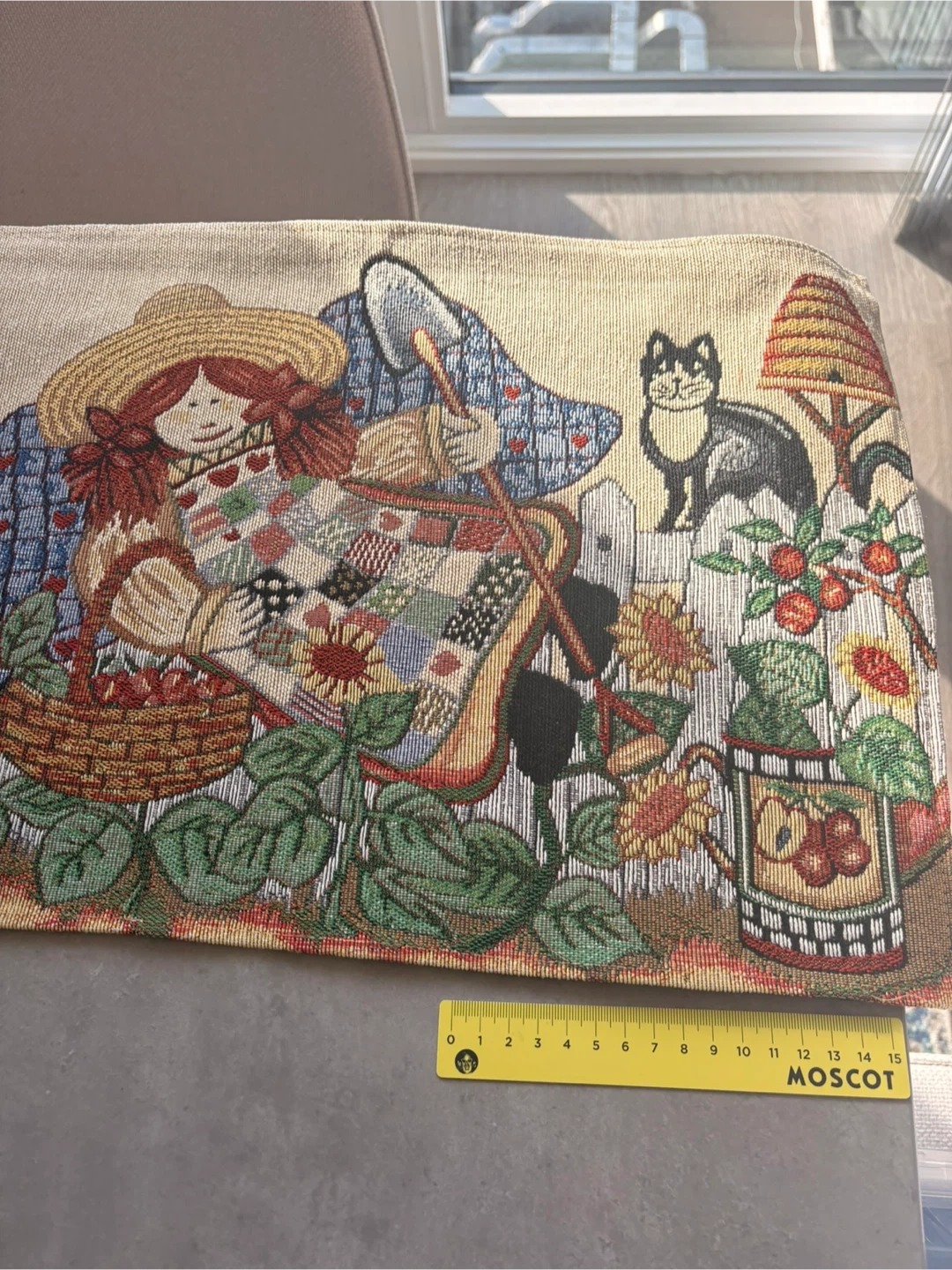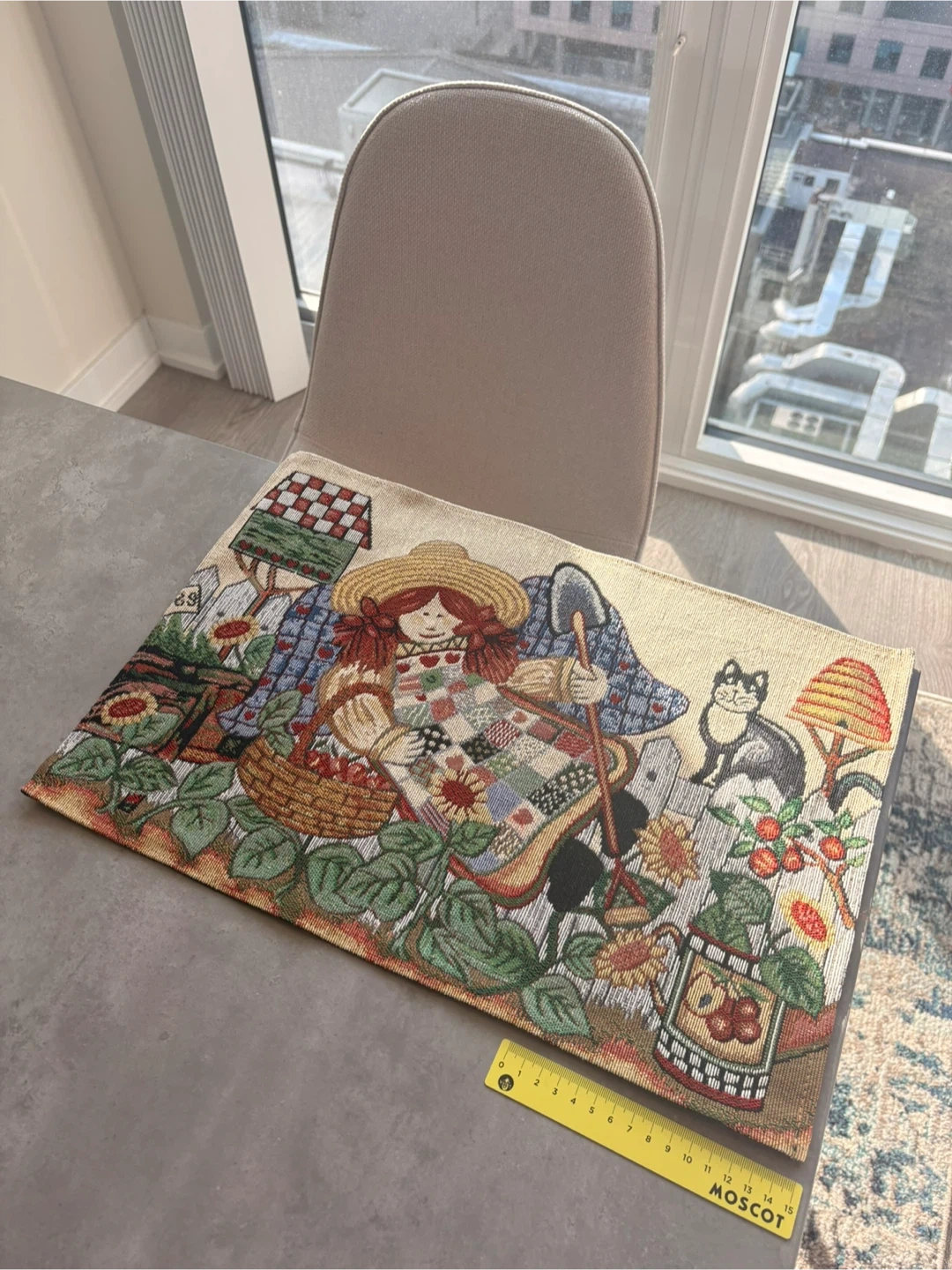 Charming country-style placemat and table runner set by Gajmoti of Canada Ltd. (Mississauga). Includes 4 placemats and 1 matching table runner with a cute farmhouse design featuring a farm girl, cat, and sunflowers. Clean and in excellent condition—great for cozy kitchen or seasonal décor.