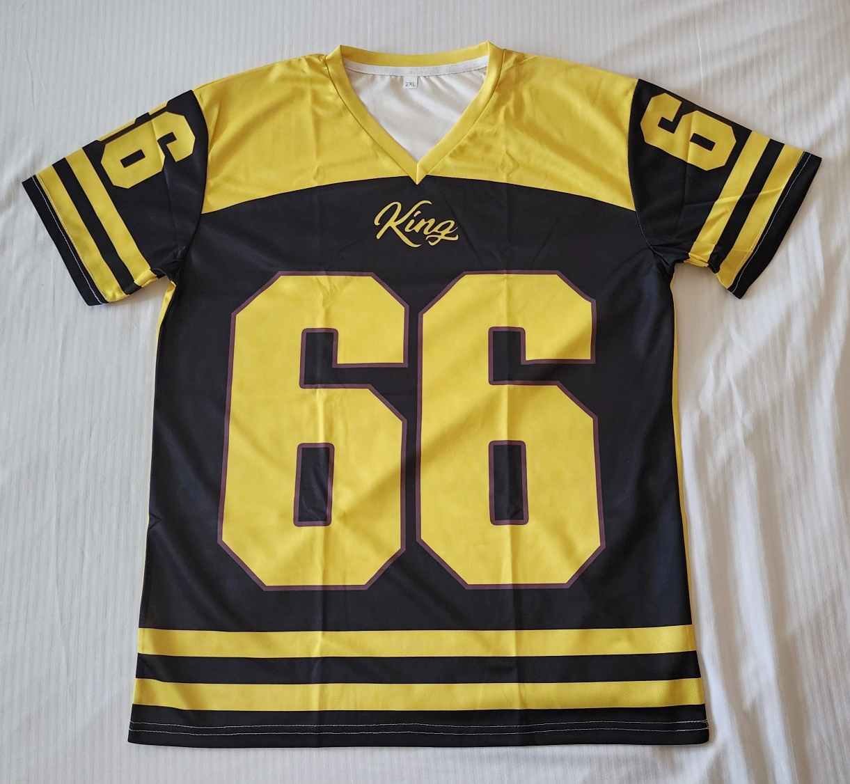 Stand out with this eye-catching black and yellow jersey featuring the iconic “King 66” design in vibrant yellow and pink. Though the tag says 2XL, it fits more like a medium to large perfect for a relaxed streetwear look or sporty vibe.