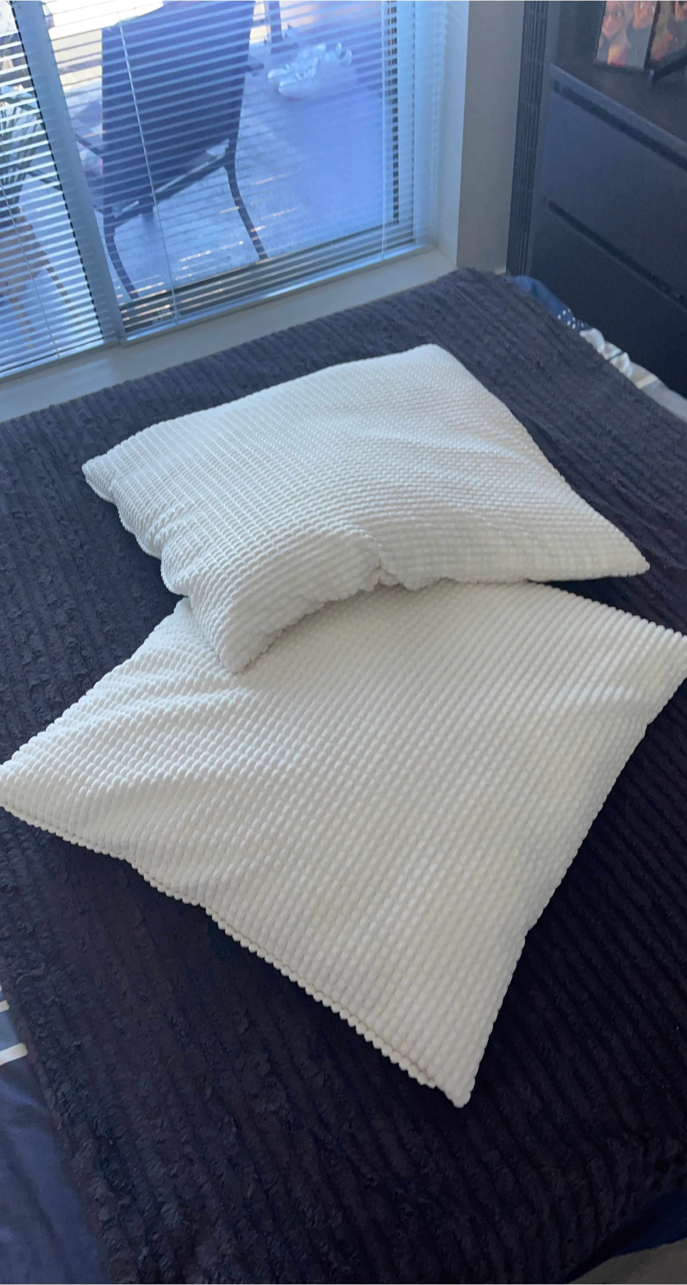 Two white textured throw pillows. They have a soft, corduroy-like fabric with a ripple pattern. A comfy addition to any sofa or bed!