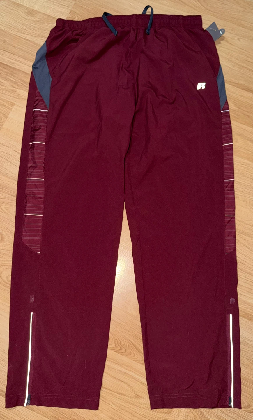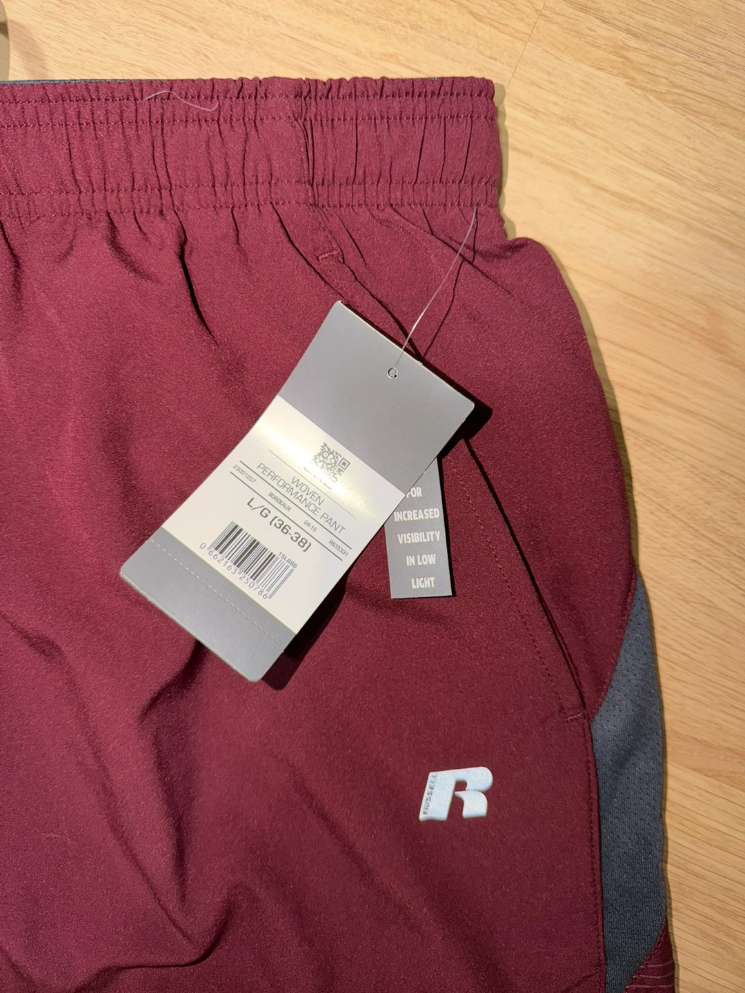 Russell Performance Woven Pants in burgundy. These pants are size L/G (36-38). They feature reflective accents for increased visibility in low light. Made with performance woven material.