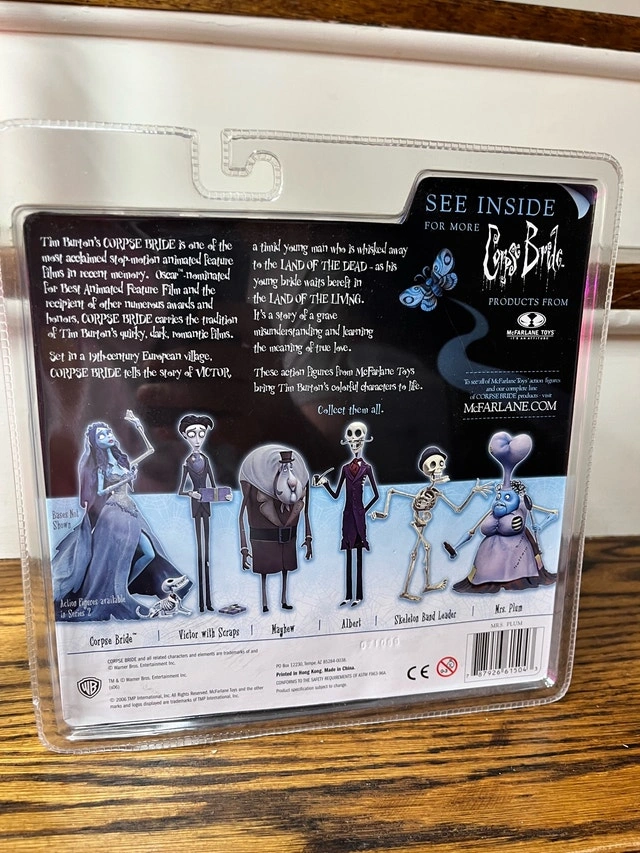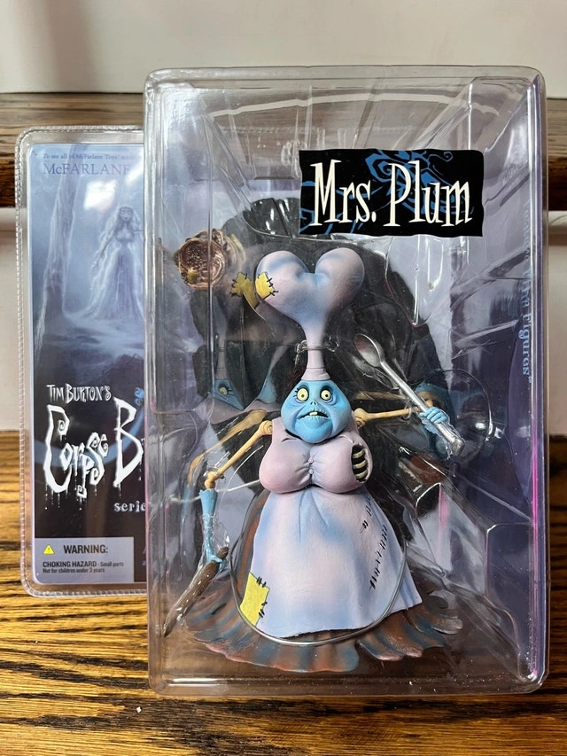 I'm selling a used Corpse Bride Mrs. Plum action figure from the Tim Burton film. This unique collectible is in good condition and comes in its original packaging. Perfect for fans of the movie or collectors of unique figurines! Character: Mrs. Plum, Movie: Corpse Bride, Series: 2, Brand: McFarlane Toys. Let me know if you're interested!