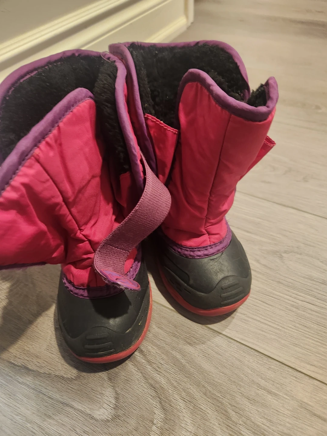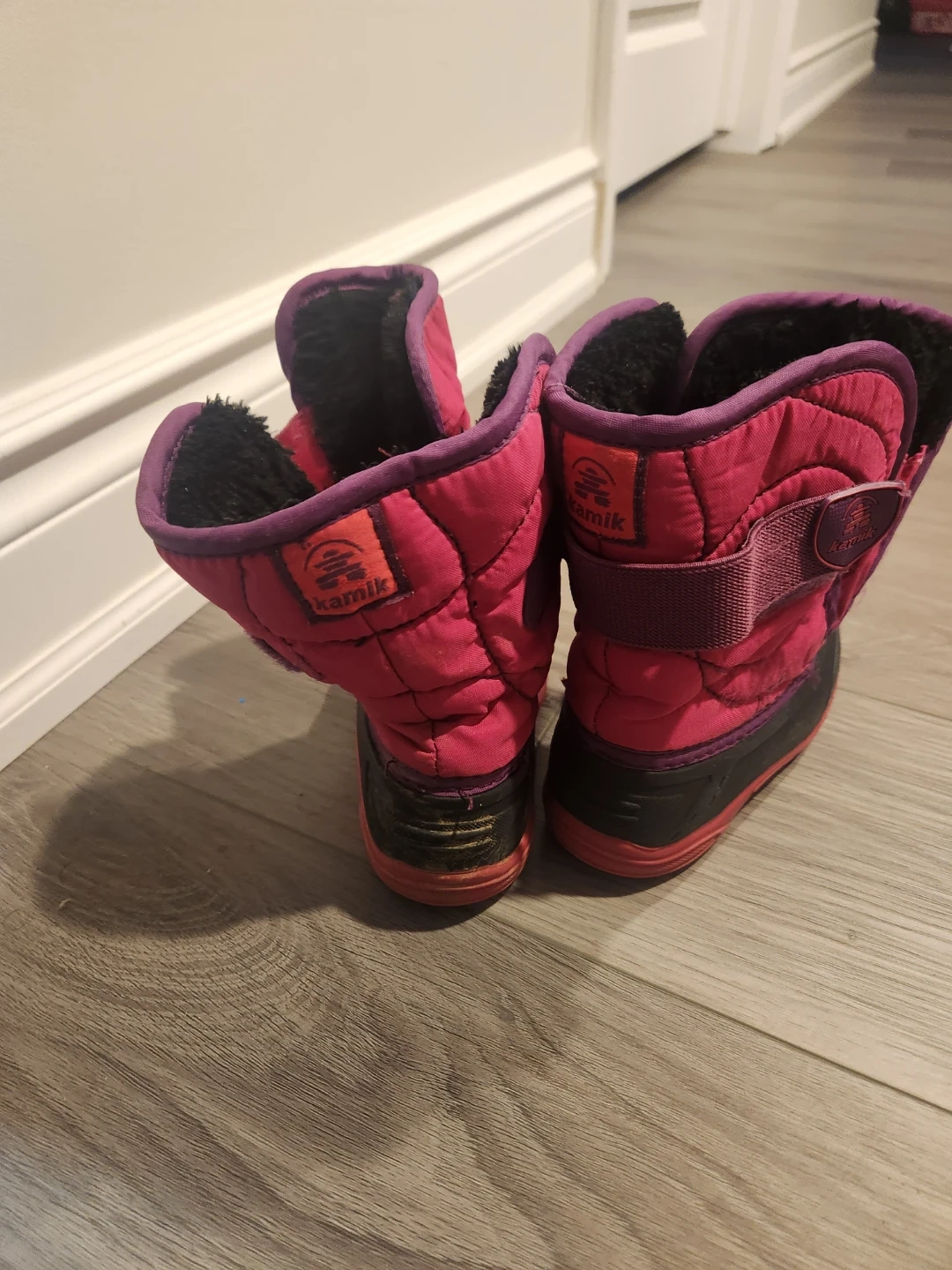 Keep your little one warm this winter with these Kamik snow boots! They're a vibrant pink and purple, perfect for adding a pop of colour to those snowy days. The boots are in great condition and ready for some fun in the snow! Size 9.