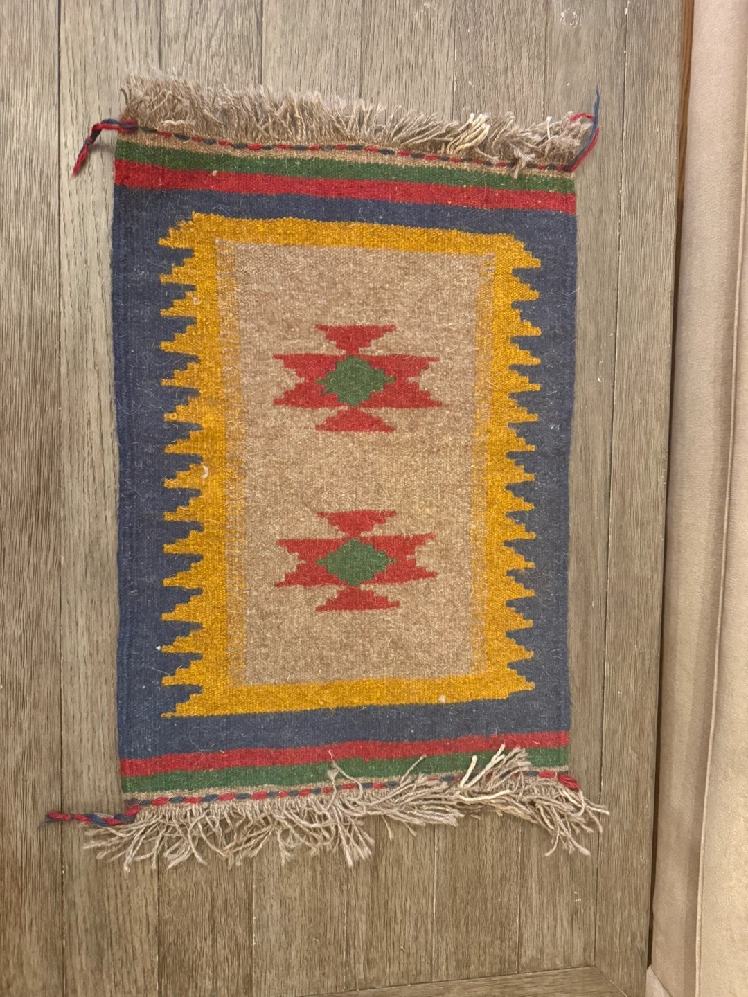 This unique accent rug features a traditional Southwestern design with geometric patterns. It's handwoven with a wool blend and has fringed edges. Perfect for adding a touch of rustic charm to a small space!