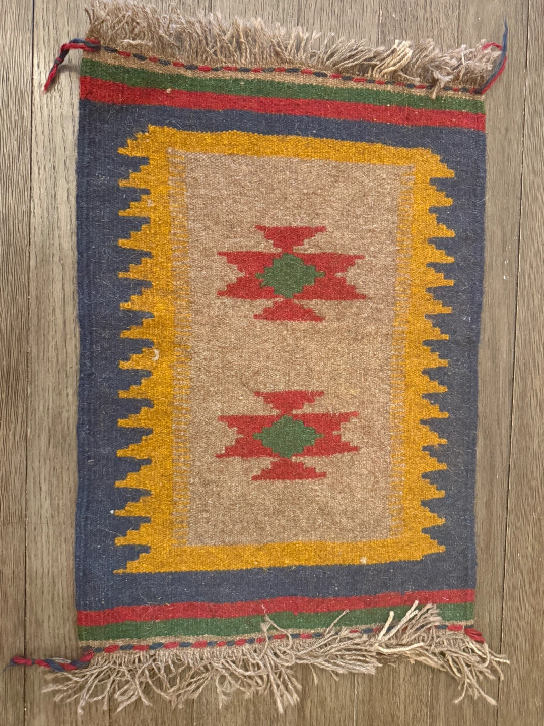 This unique accent rug features a traditional Southwestern design with geometric patterns. It's handwoven with a wool blend and has fringed edges. Perfect for adding a touch of rustic charm to a small space!