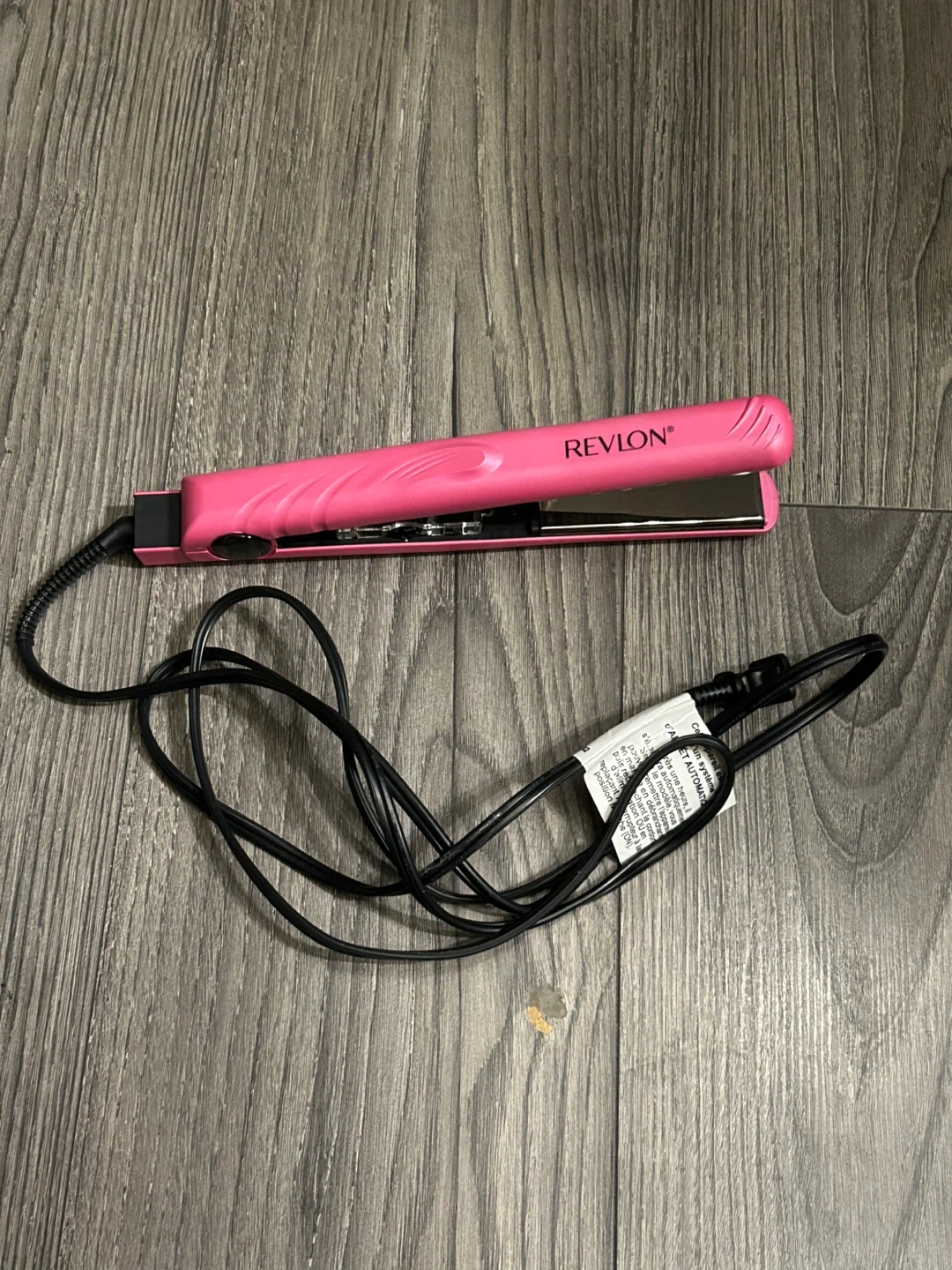 This is a Revlon pink hair straightener. It has ceramic plates and adjustable temperature settings. Perfect for achieving smooth, straight hair quickly!