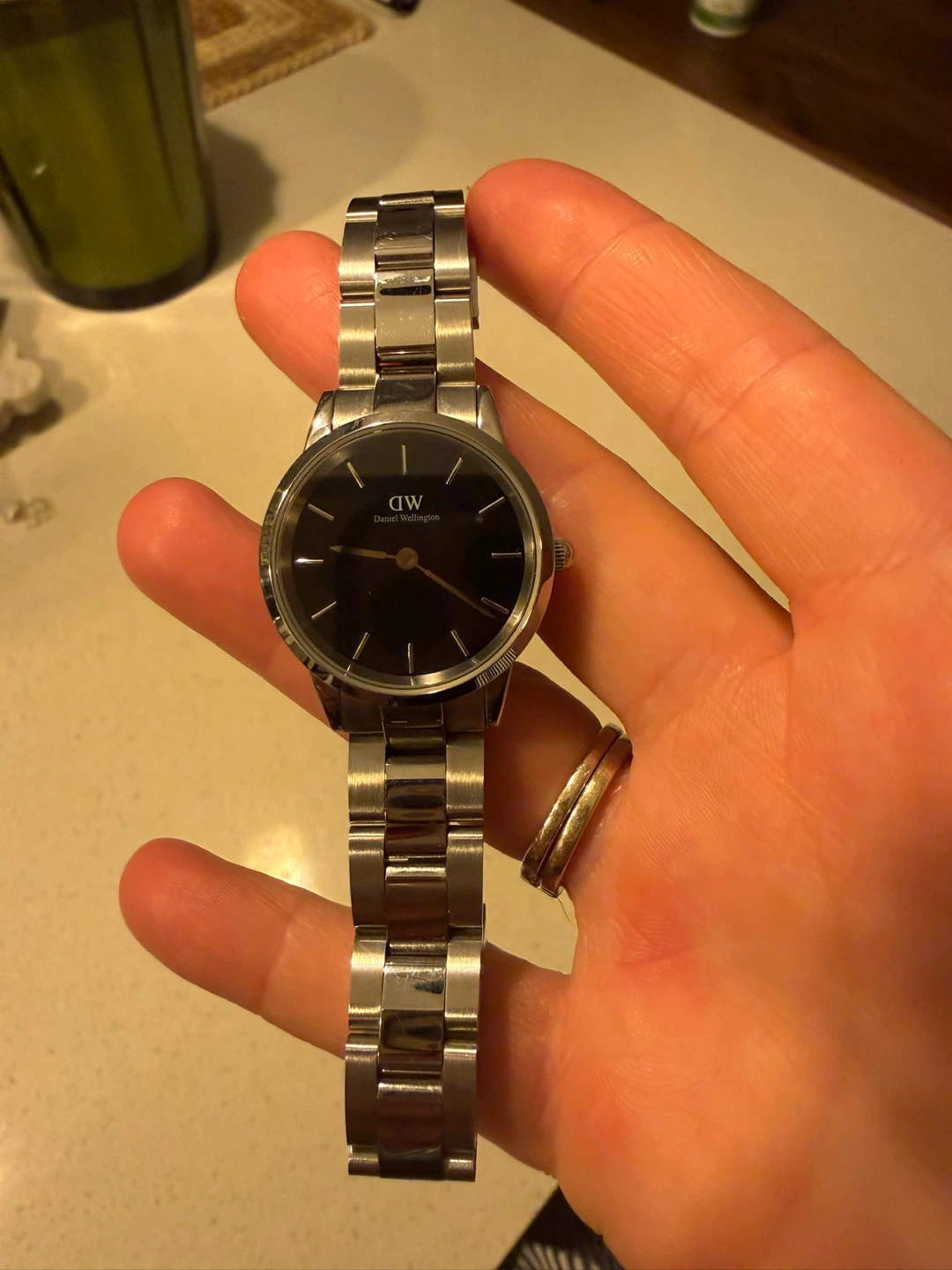 This is a Daniel Wellington watch with a black face and silver stainless steel band. It's a classic timepiece that goes with everything.