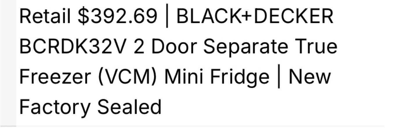 This is a new, factory-sealed BLACK+DECKER BCRDK32V mini fridge. It boasts a 3.1 cu. ft. total capacity, with 0.9 cu. ft. dedicated freezer storage. The fridge features a 2-door design and a recessed door handle for a sleek look. Pick up border of Brampton and Caledon