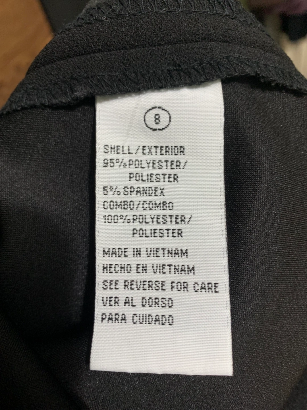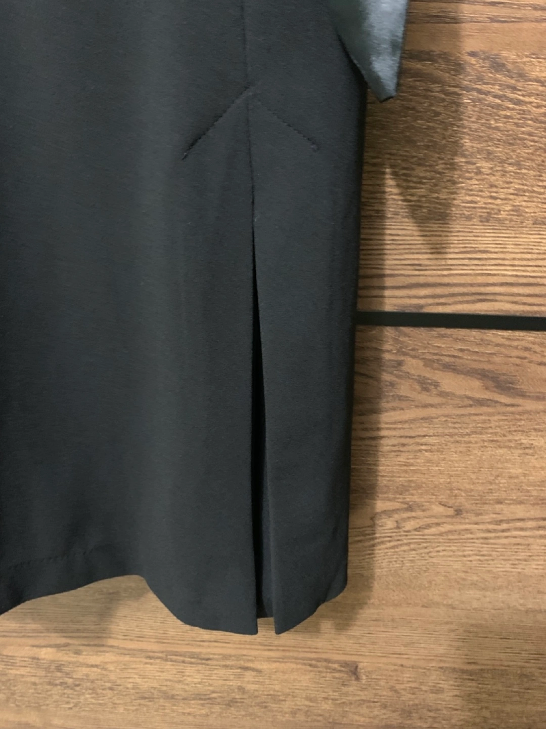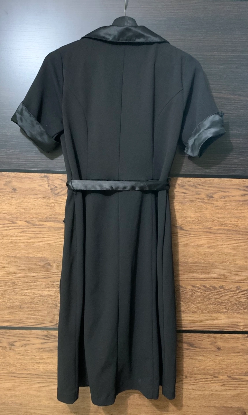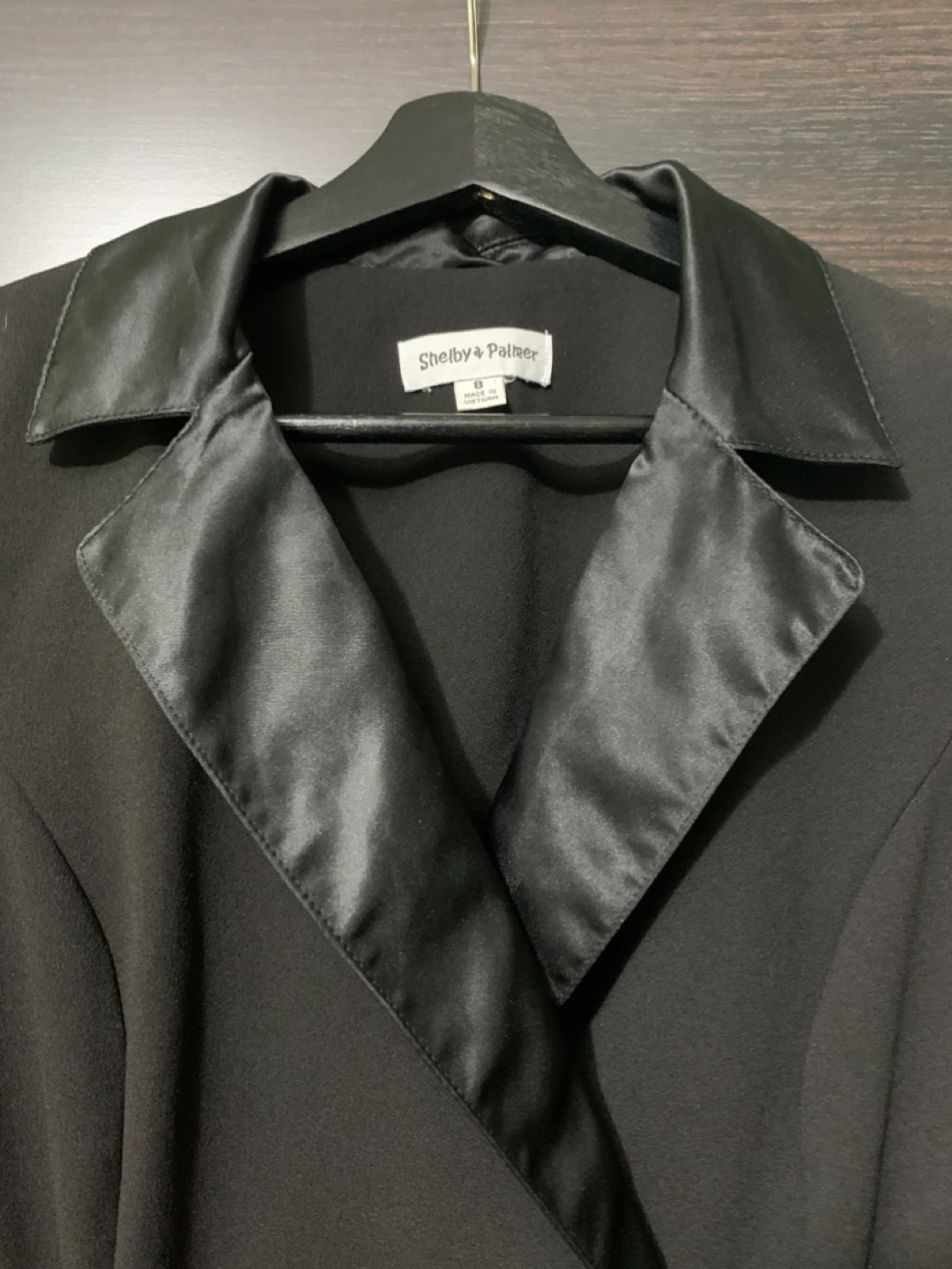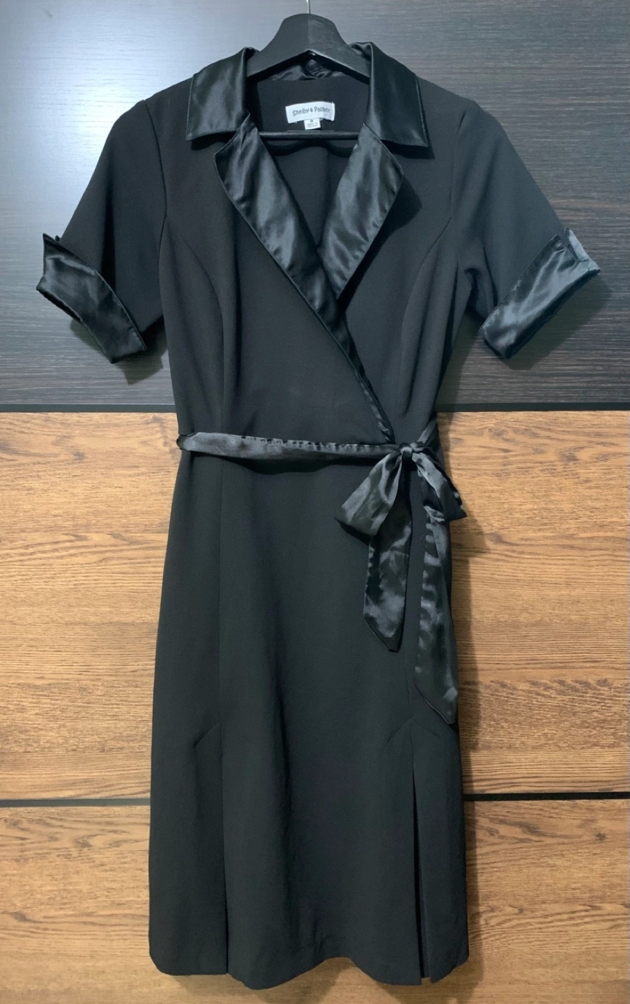 Black dress with satin trim, short sleeves, and a tie at the waist. Shelby & Palmer clothing pieces are well-made, classic-looking, and stylish. Size 8. Never worn.