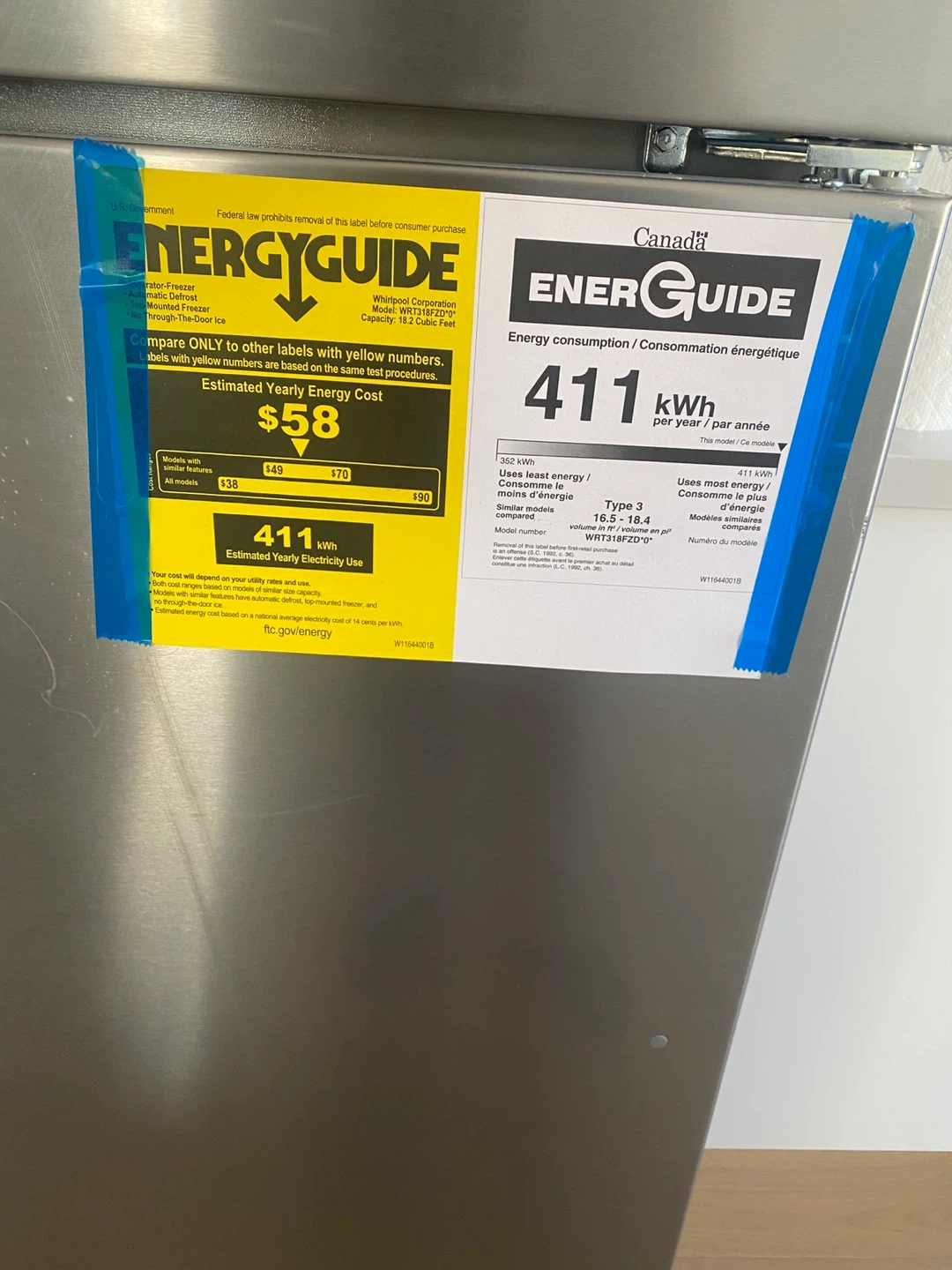 Brand new Whirlpool top-freezer, frost-free refrigerator. Capacity: 18.2 cubic feet. Estimated yearly electricity use is 411 kWh.