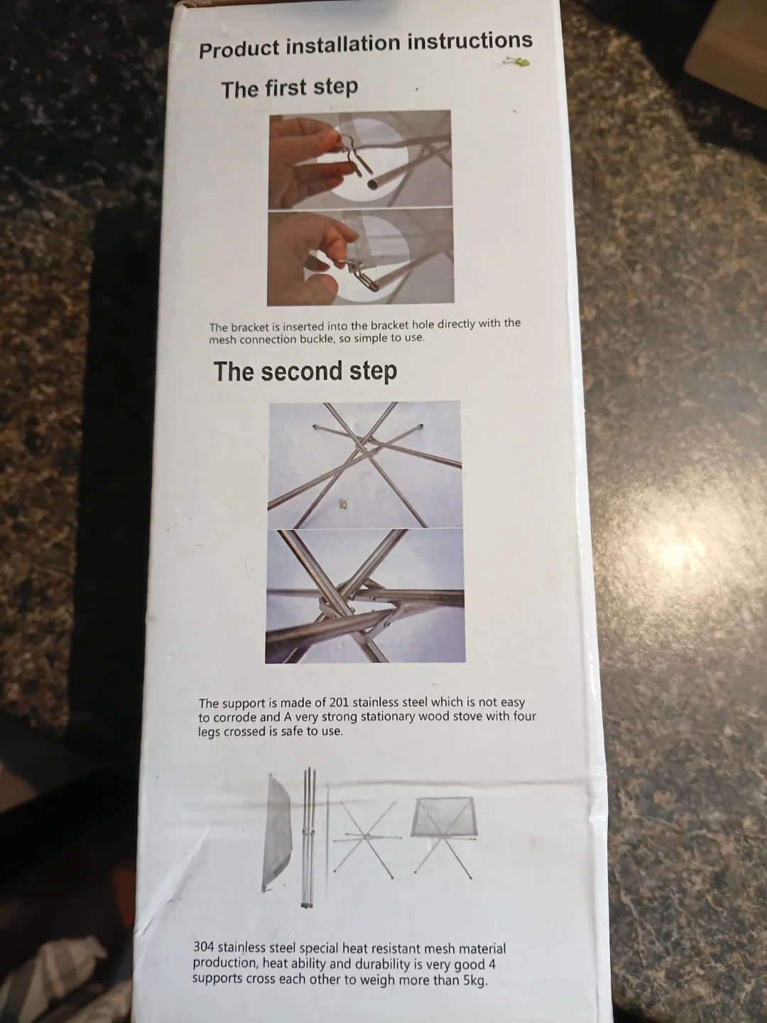 The support is made of stainless steel, ensuring durability. It's designed with four legs for stability and can support more than 5kg.