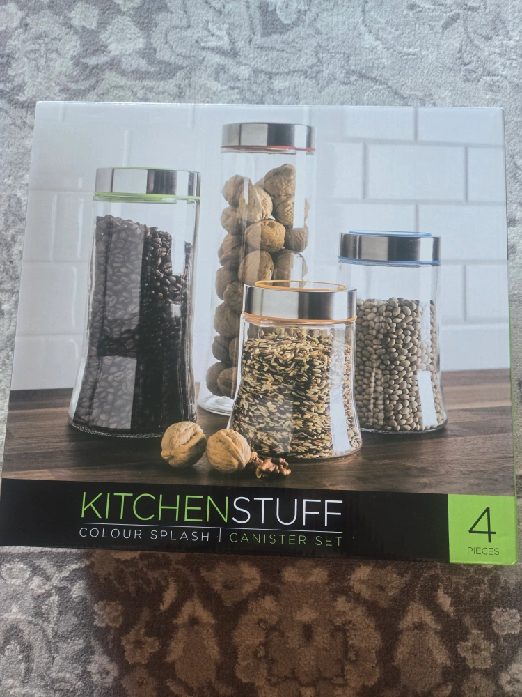 Selling a Kitchen Stuff Colour Splash canister set, brand new in the box! This set includes 4 pieces, perfect for adding a splash of colour to your kitchen while keeping your ingredients fresh and organized