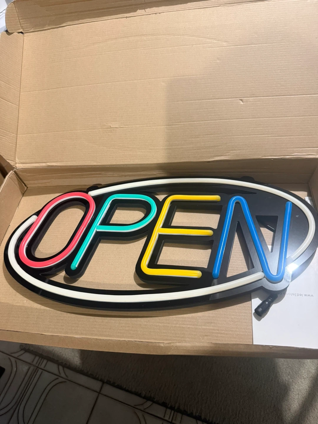 This is a colourful LED open sign with a remote control. It's great for businesses looking to attract customers. The sign is made of durable materials and comes with a power cord and remote.