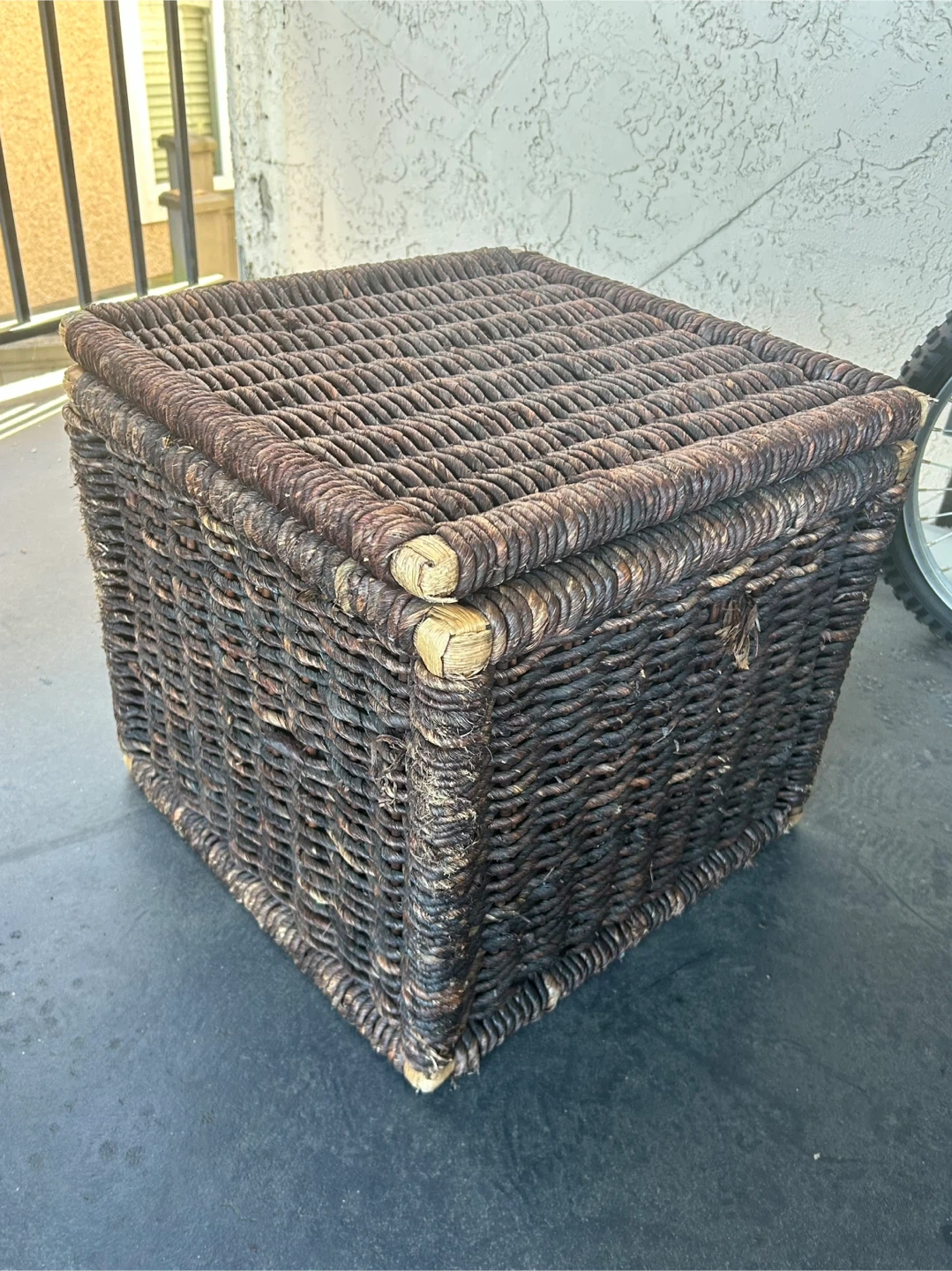 Selling a dark brown wicker storage chest with a hinged lid. Its woven construction makes it a unique accent piece for any room. The lid opens to reveal ample storage space inside.