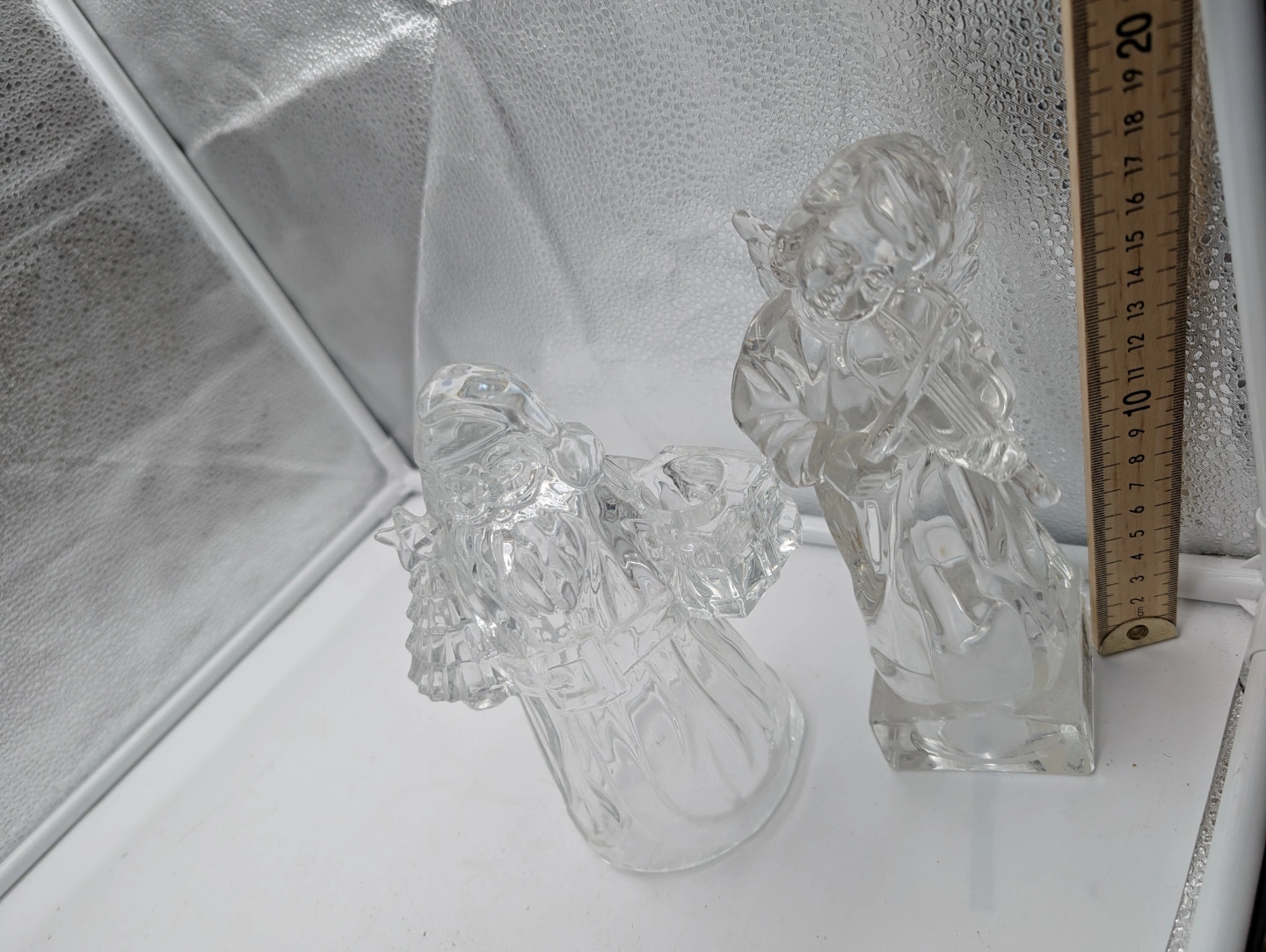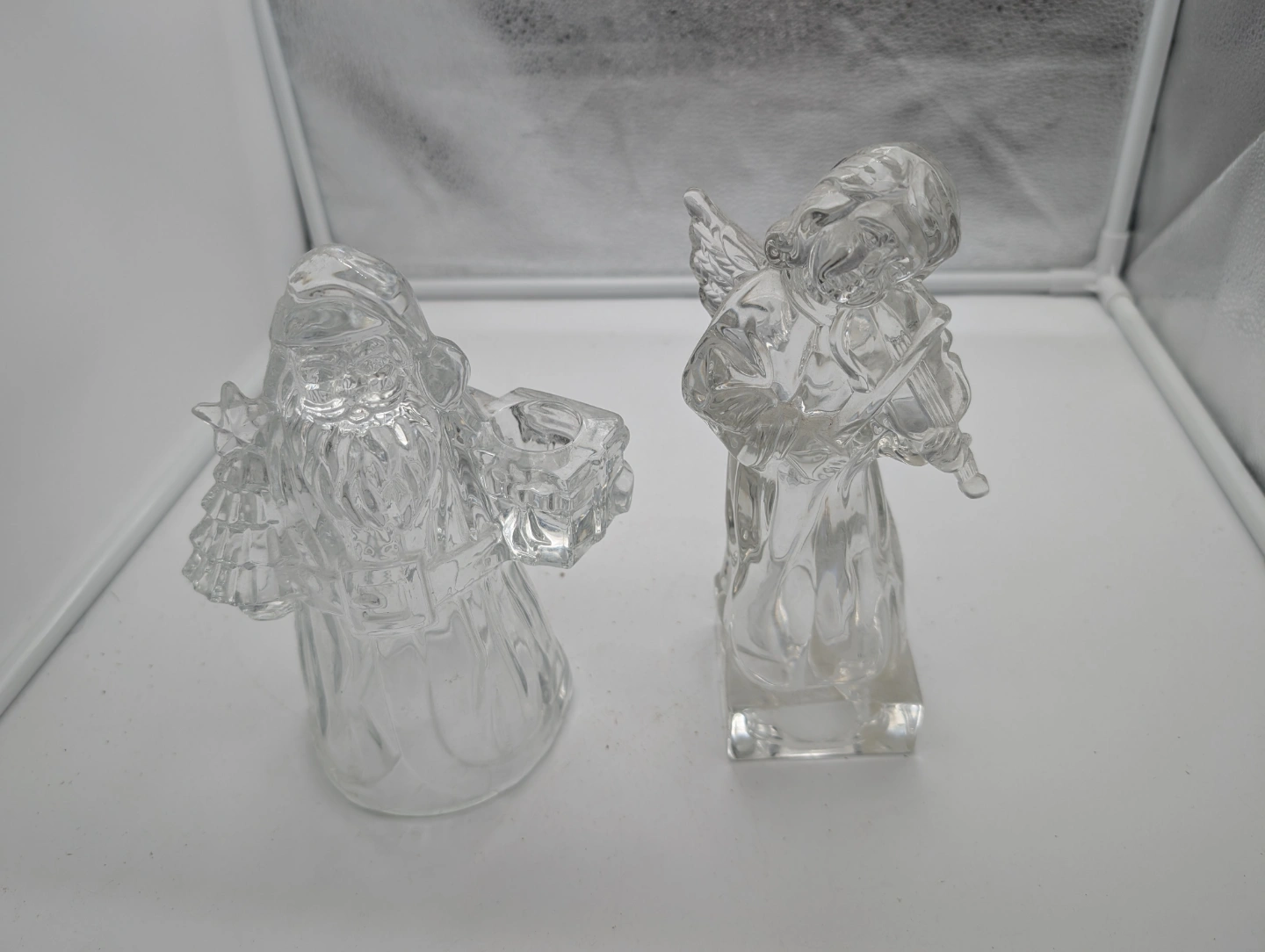 Pair of clear glass Christmas figurines. Santa Claus holds a Christmas tree and a gift. Angel plays a violin. Small, collectible items. Perfect for holiday décor.