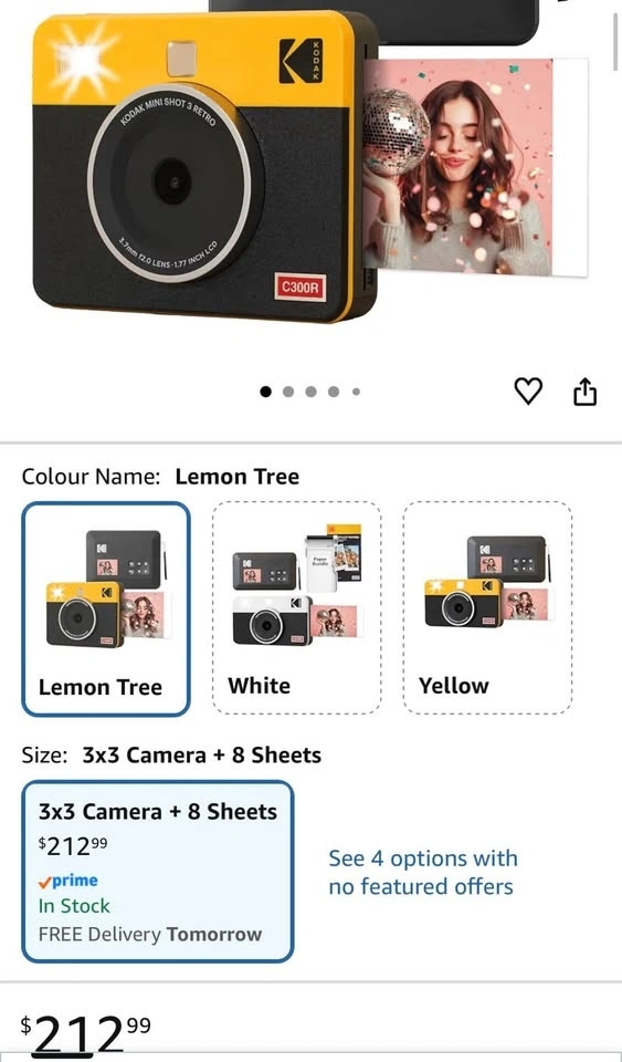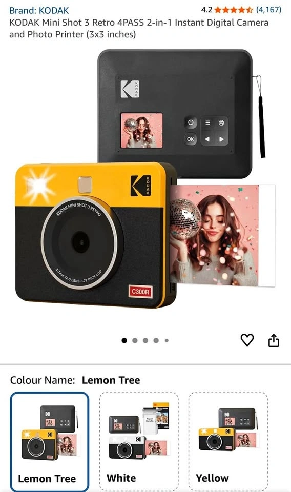 This is a KODAK Mini Shot 3 Retro 2-in-1 Instant Digital Camera and Photo Printer. It features 4PASS technology for superior photo quality, producing prints that are laminated, fingerprint, and water-protected, lasting over 100 years. You can print 3x3" photos directly from your mobile device via Bluetooth (compatible with Apple iPhone, iPad & Android). It supports both bordered and borderless photo types. The camera comes with a free case and includes 8 sheets of film. The item weight is 467 grams and dimensions are 13.7 x 16 x 5.8 cm. Download the KODAK Photo Printer app for decorative features like filters and frames. Let me know if you're interested!