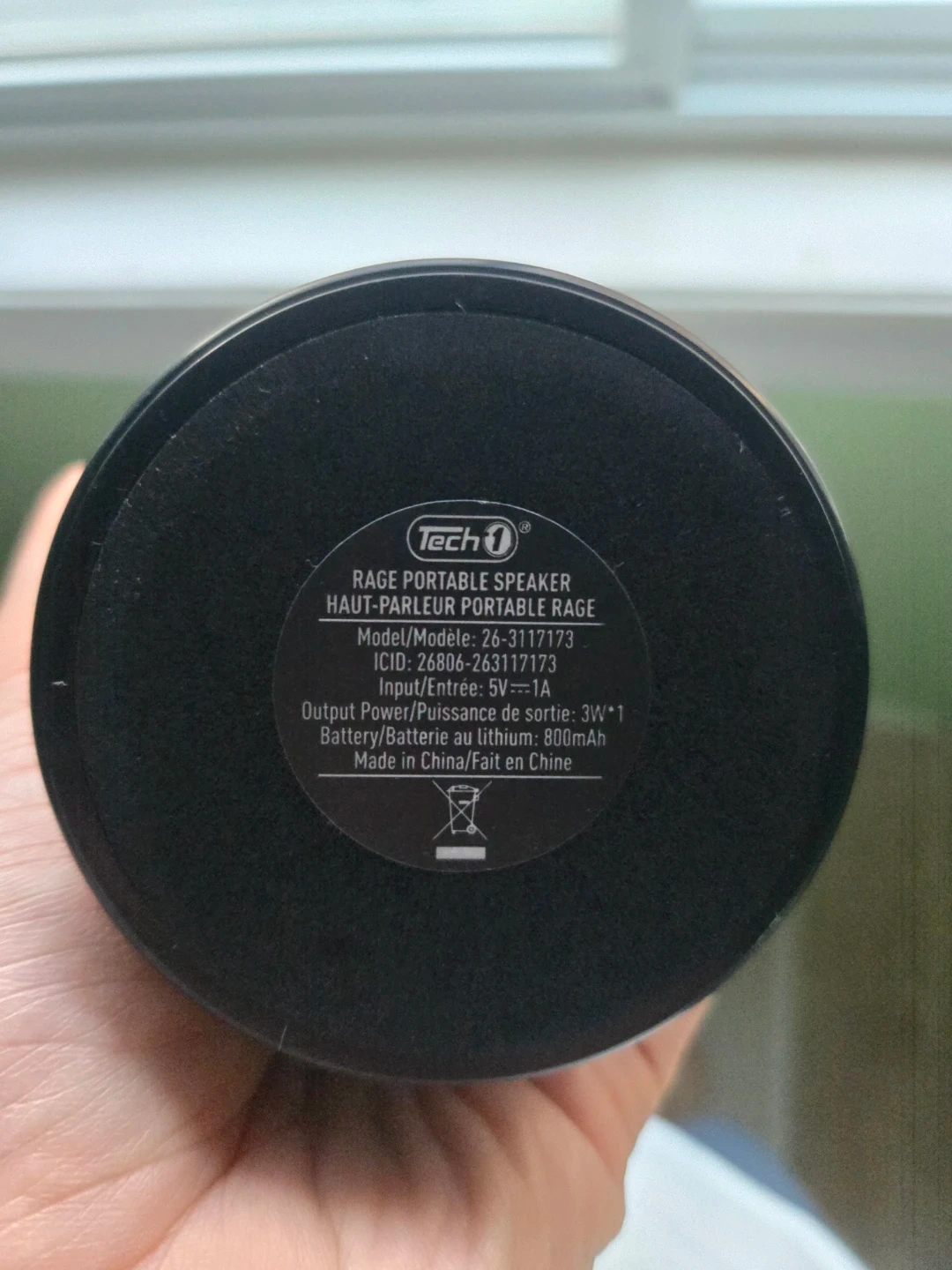 Black Tech Gear Rage portable speaker. Model Z6-3117173. It has an 800mAh battery. Great for music on the go!